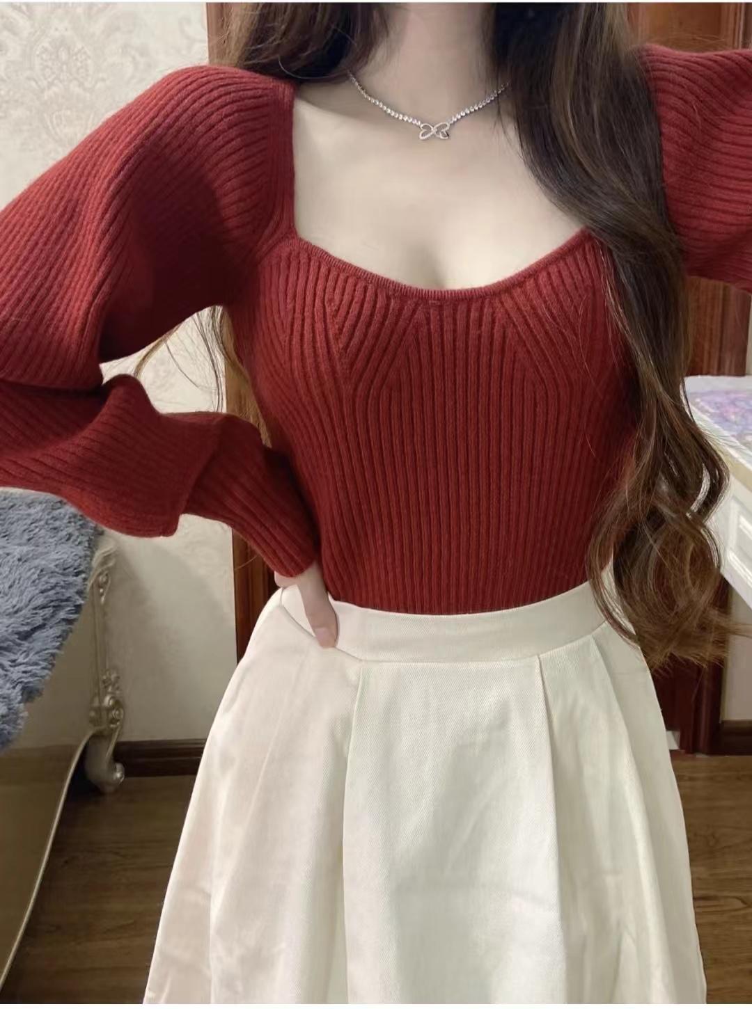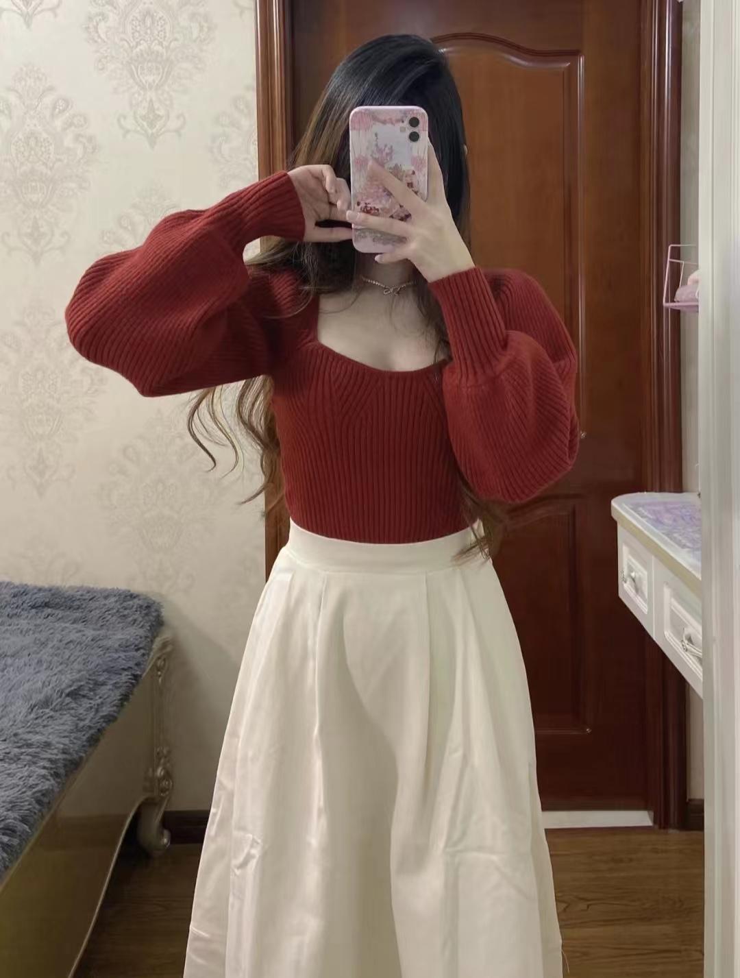 这套真的好显气质+温柔优雅,泡泡袖红色针织衫单穿或者当内搭都可,搭配奶白色伞裙很港风,涂个大红唇+卷个大波浪绝了~
