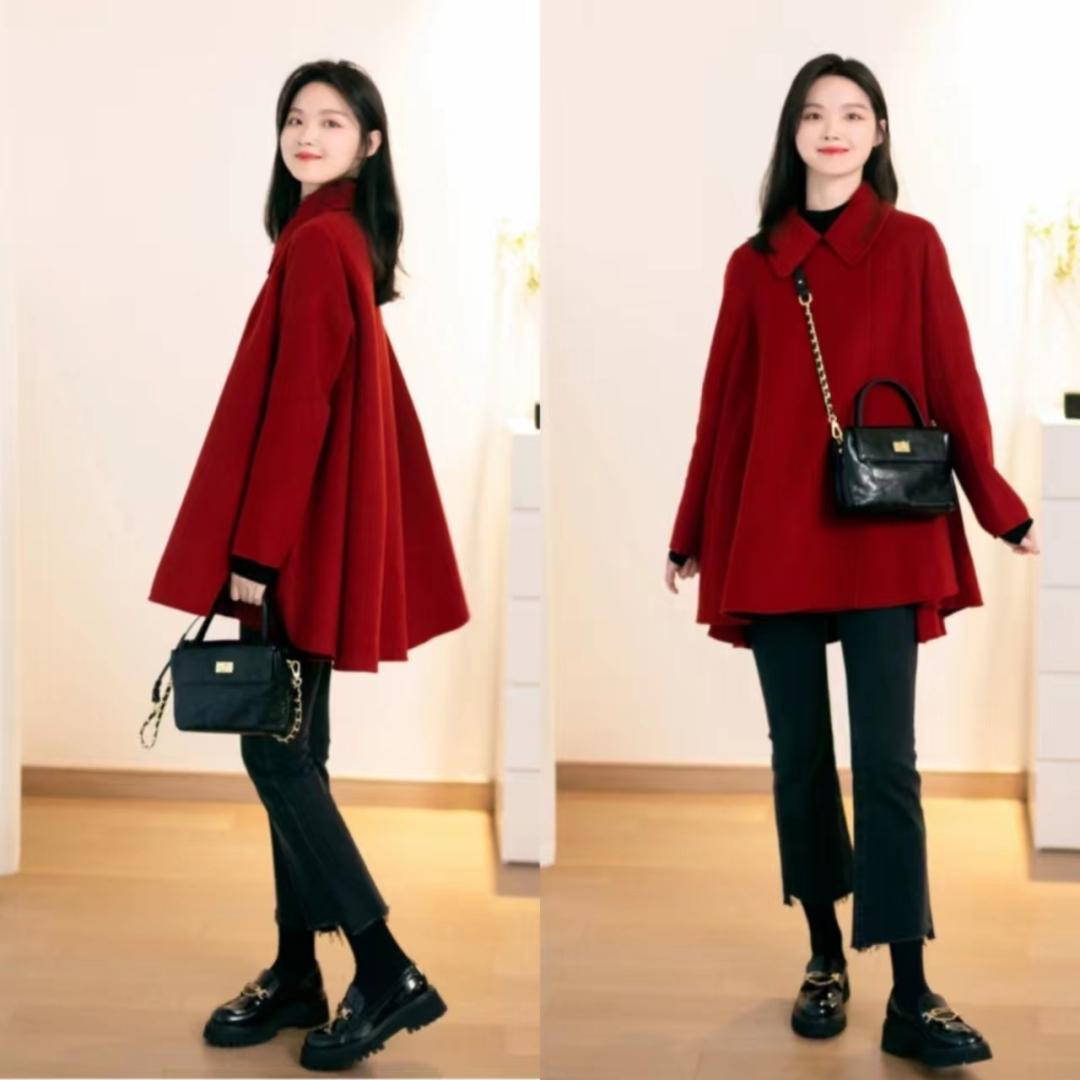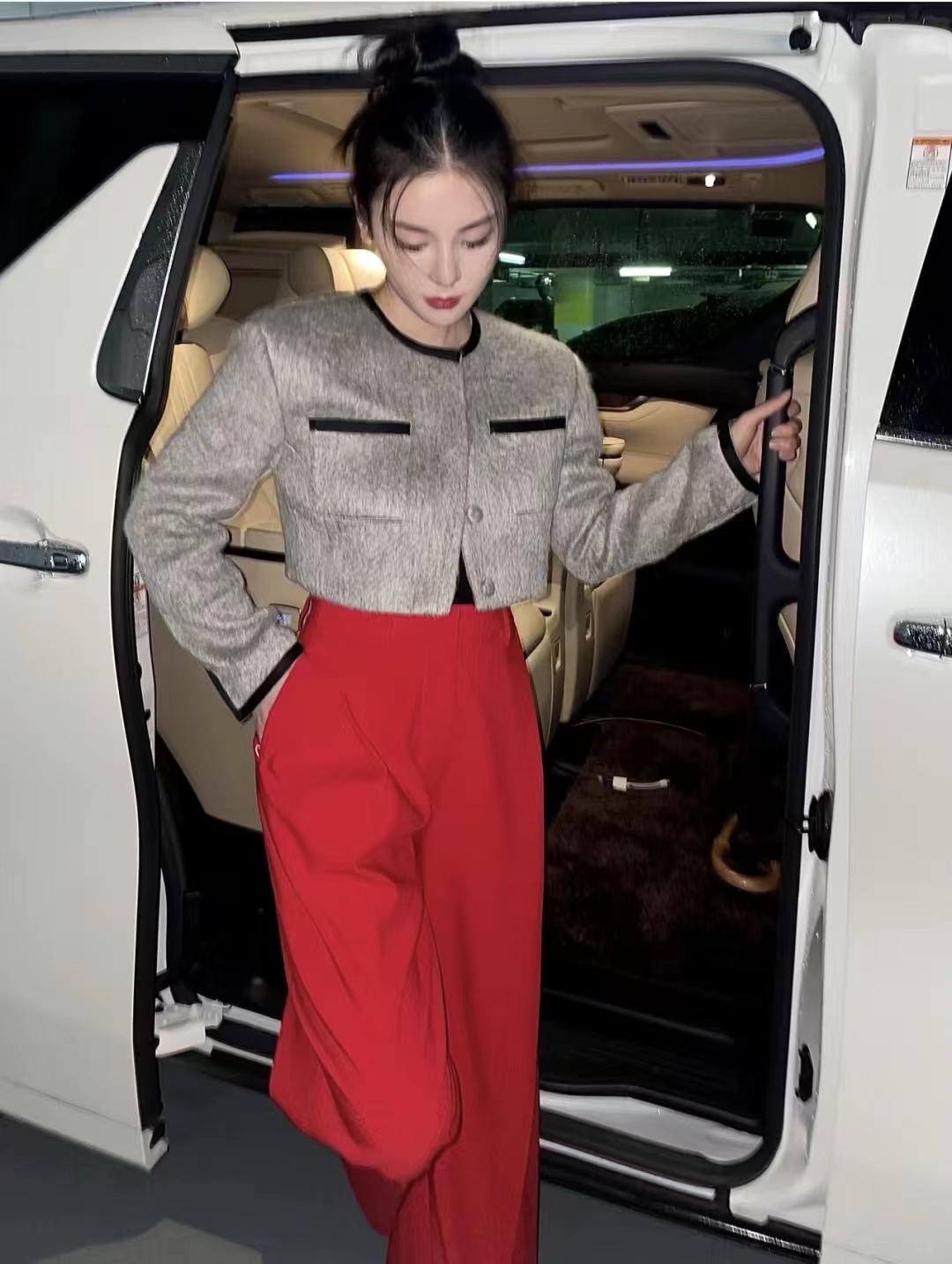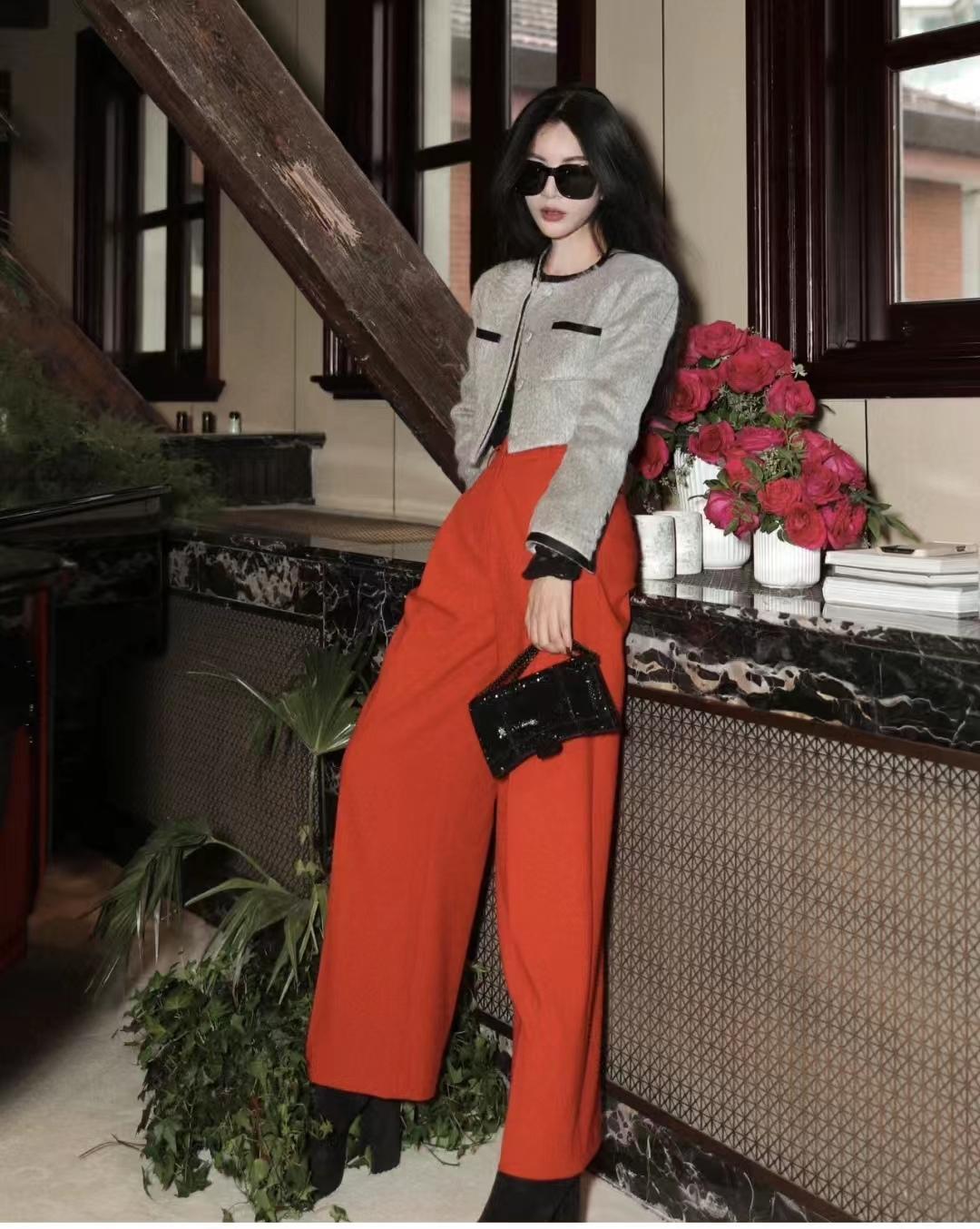 红色压褶阔腿裤搭配“灰色羊毛短外套” 高级且和谐,高饱和的红色搭配低调的浅灰色,不仅让红色变得日常且人人都可驾驭!