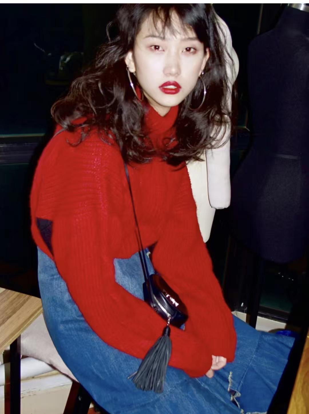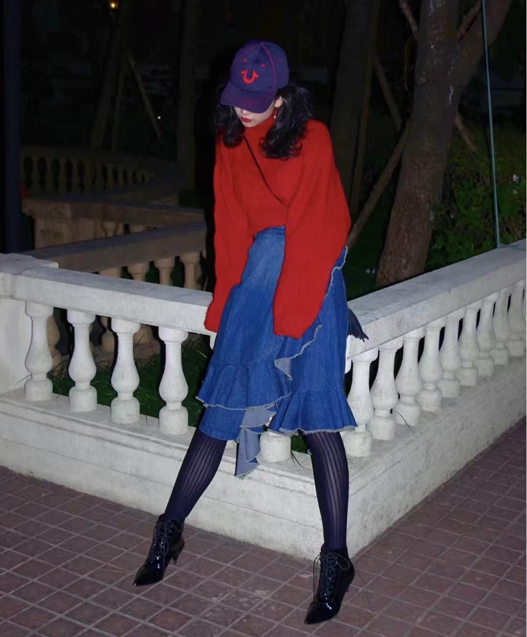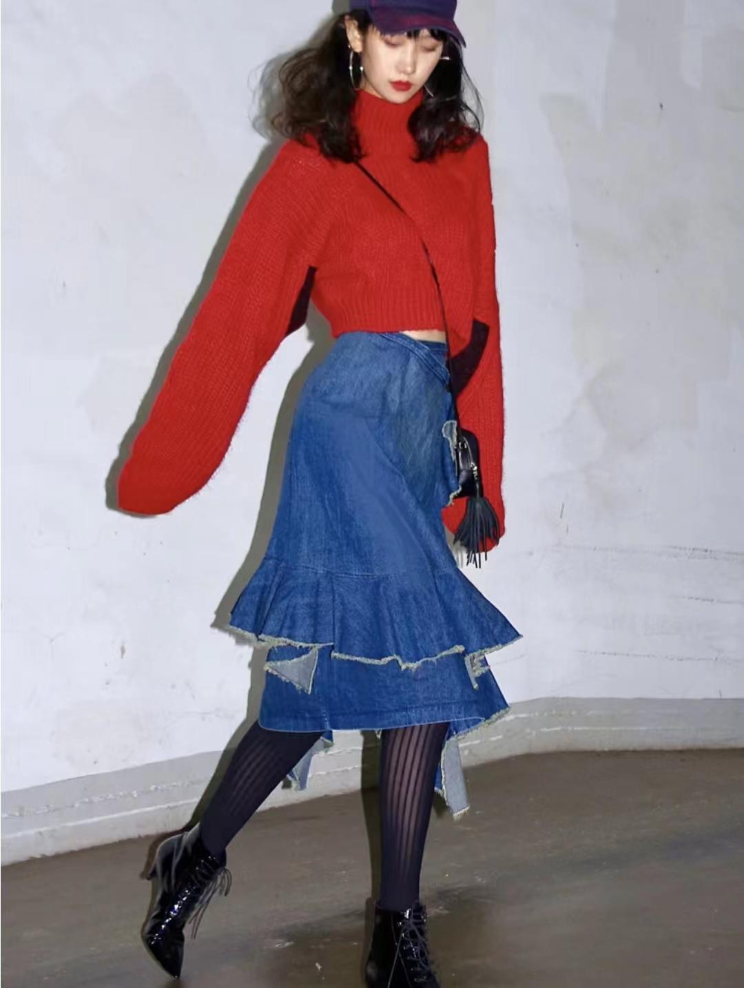除了全身total红的造型外,蓝色也适合和红色搭配,颜色既跳眼又时髦,毛衣和牛仔的质料也一点都不会奇怪,高腰毛衣+高腰裙可以把比例凸显的好~