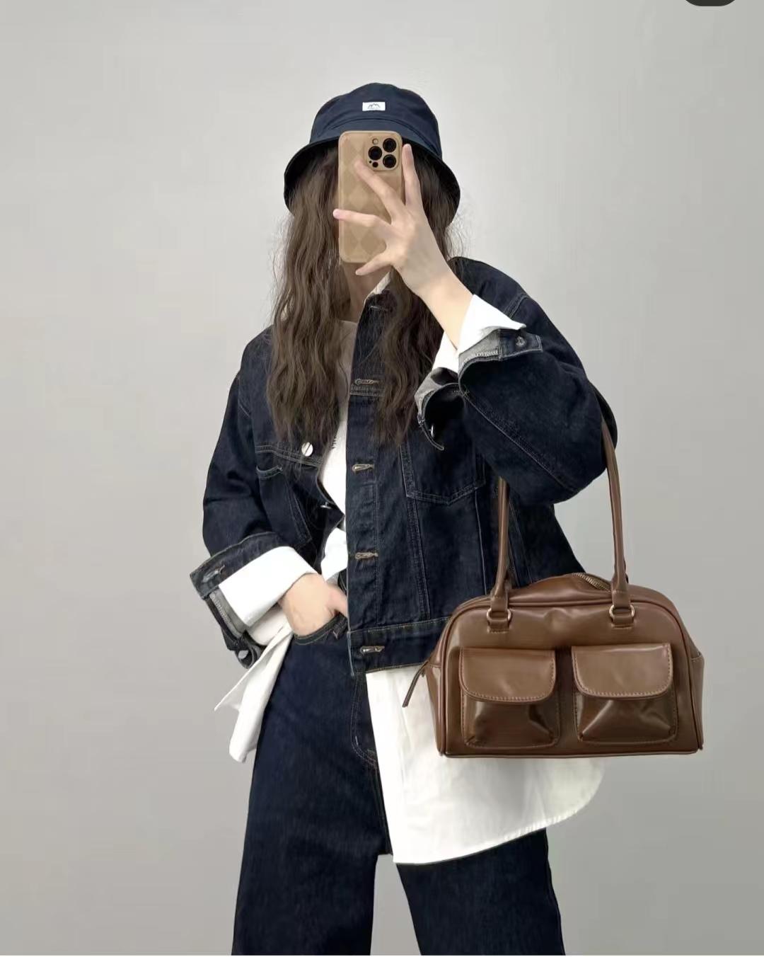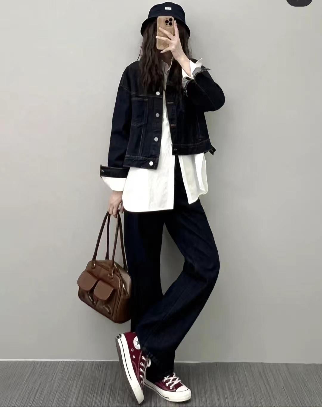 look2 白色衬衫+深蓝色牛仔套装/红色包包点缀