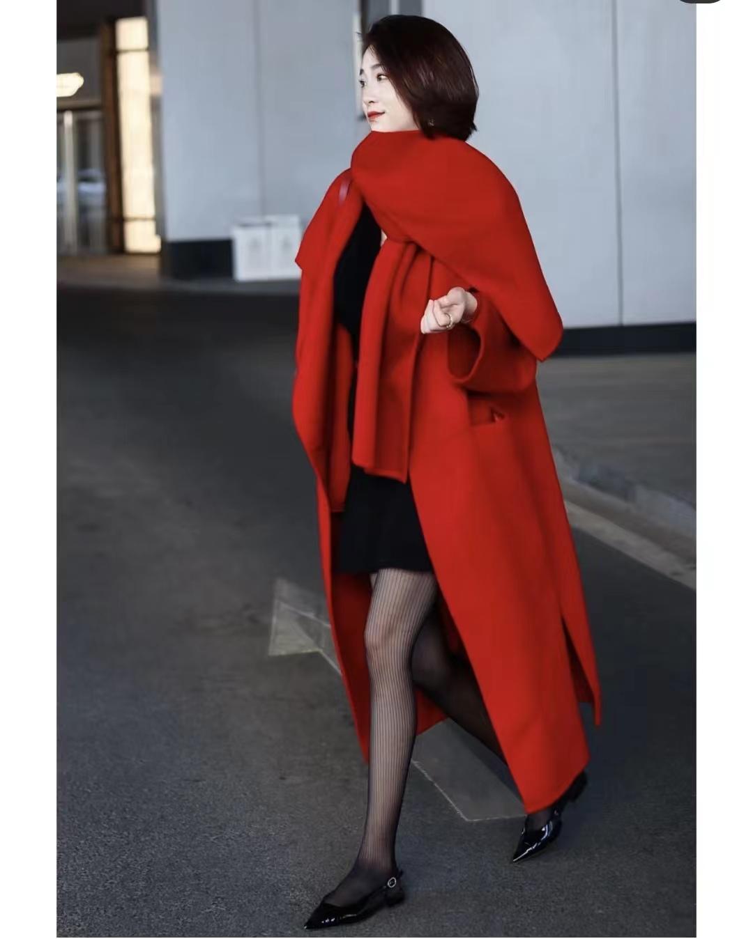 红色上身真的比想象中显气质,皮肤白的姐妹们更应该大胆尝试。可拆卸的围巾让大衣有了更多可能性,内搭黑色针织短裙+丝袜,这套出街太惊艳了~