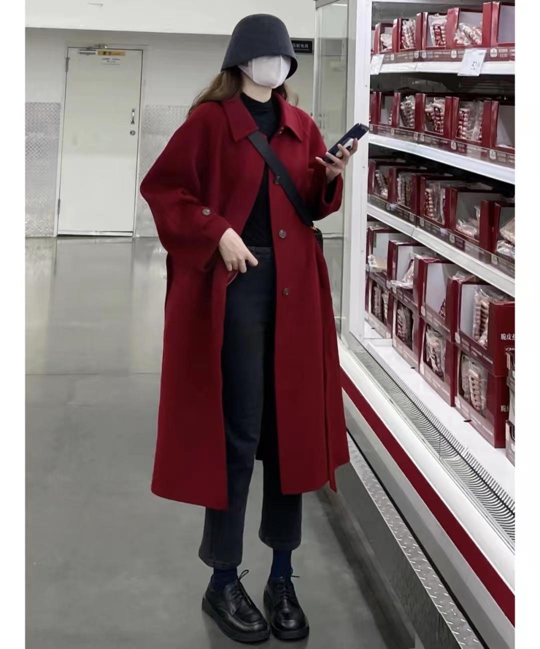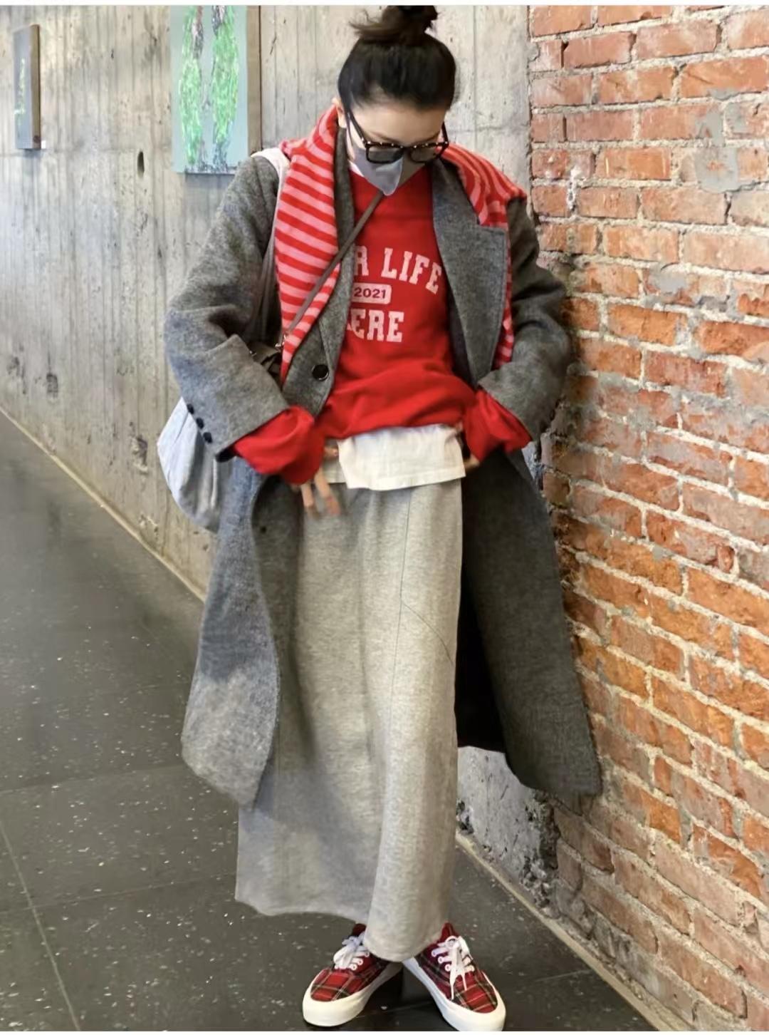 认为红黑组合有“土味”的朋友可以尝试红+灰。大衣选了浅灰色,配红色浅花灰更洋气,又有喜气洋洋的气氛,也不会落得俗套土气~
