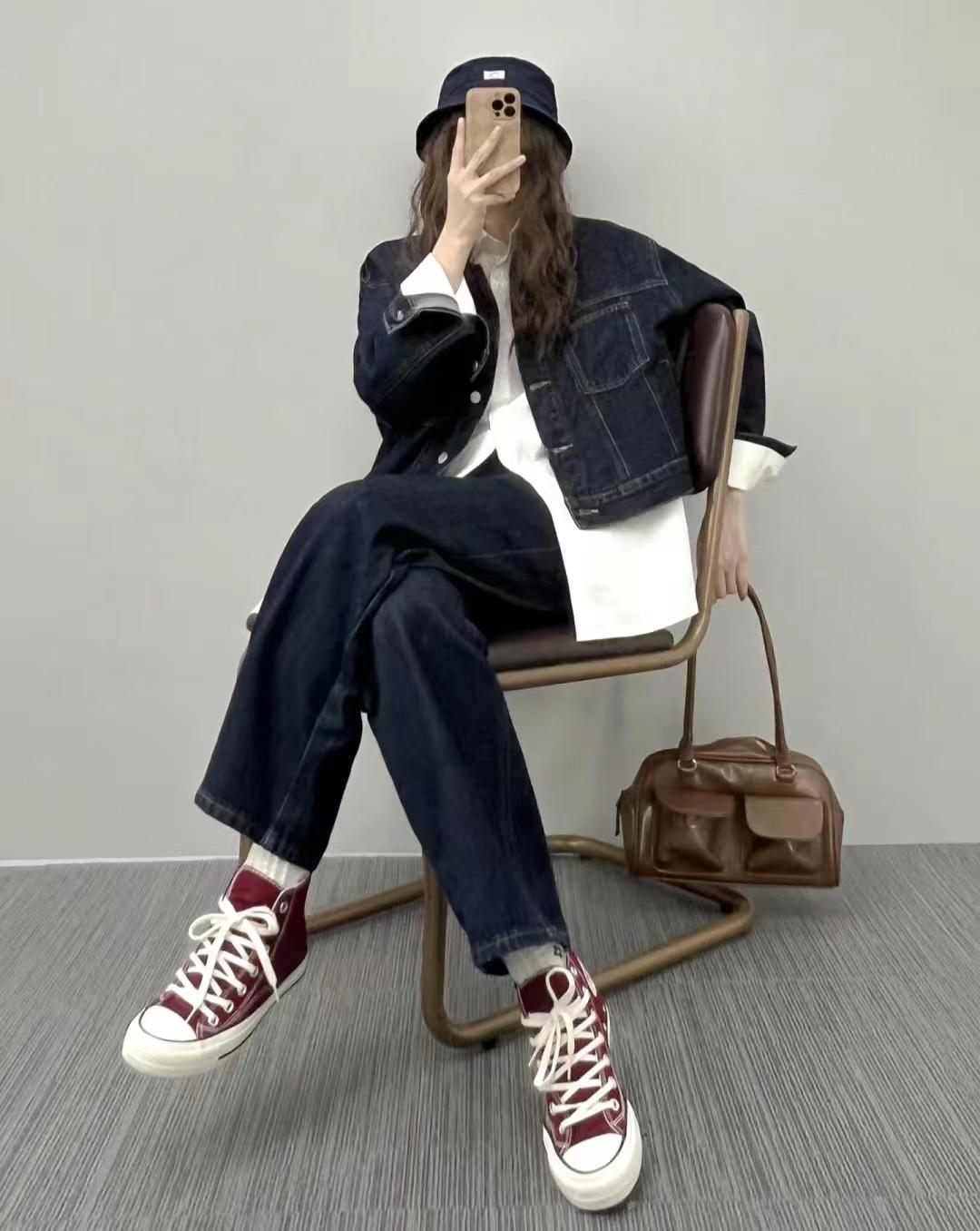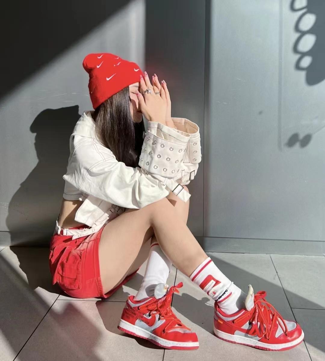 白红搭配真的太吸睛啦,而且有节日氛围。设计感白色工装外套还带点机能感,牛仔做旧短裙直接拉长腿部比例,显高显瘦,红色满印针织帽和裙子球鞋颜色呼应,具有整体感~