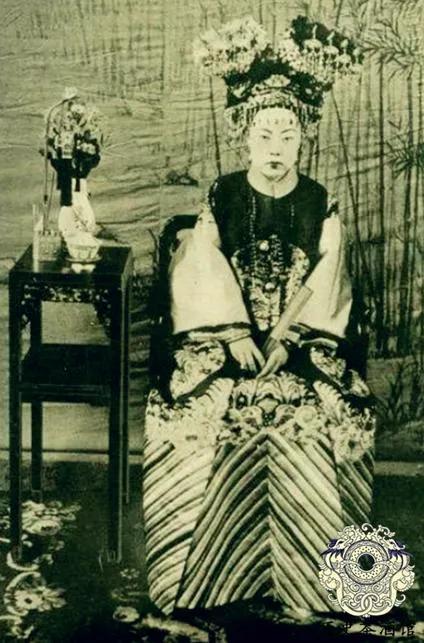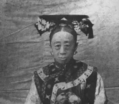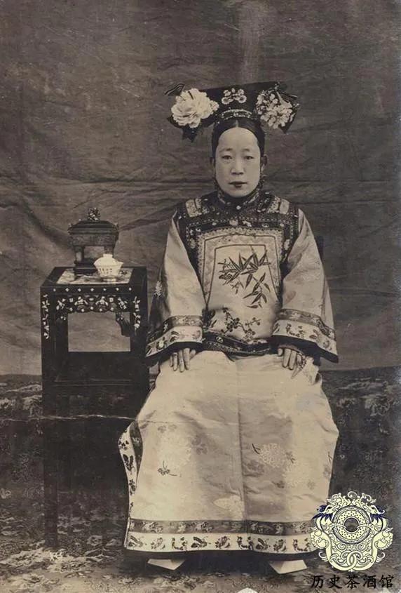 克勤郡王晋祺的格格,格格戴着缀满珠玉的头冠,衣着华丽。克勤郡王是清朝的铁帽子王之一,一共传了十三代十七人,后一代克勤郡王是晏森,此人生活奢靡,败光家产后竟然卖祖坟,后卖祖坟的钱也败光了,不得不靠着拉黄包车维持生计。