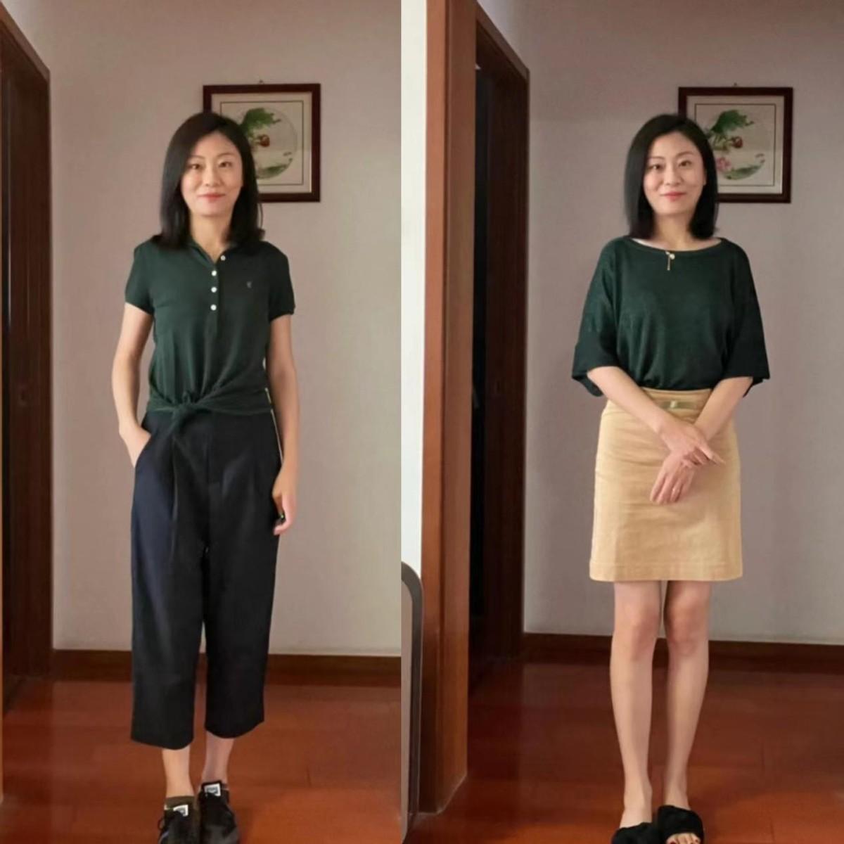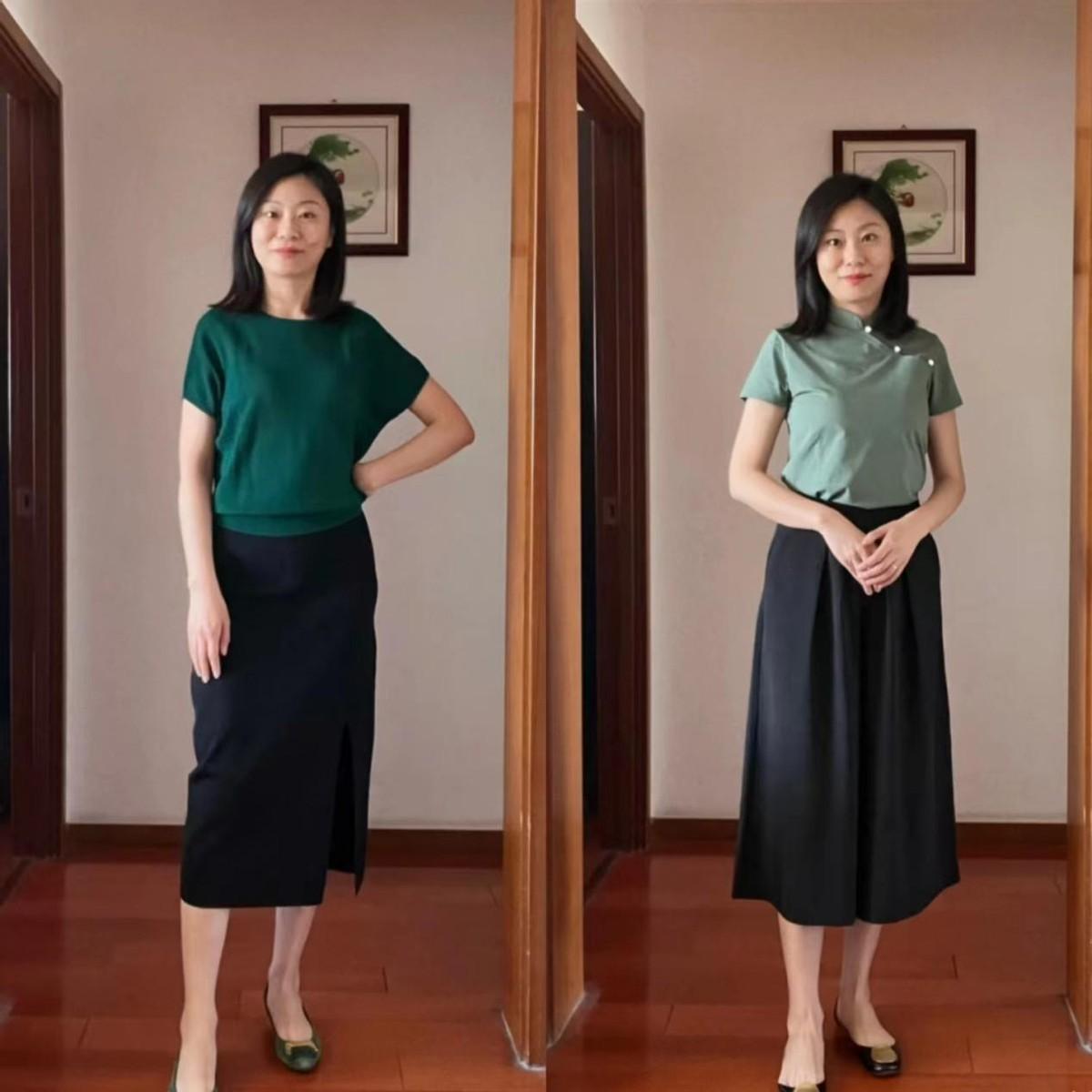 我们可以看看这位中年妈妈丹小竹,无论是茱萸粉色针织衫还是上面这些绿色系上衣,用来搭配黑色裙装、裤装,都能起到转移视线作用,同时驱散黑色系的压抑氛围。