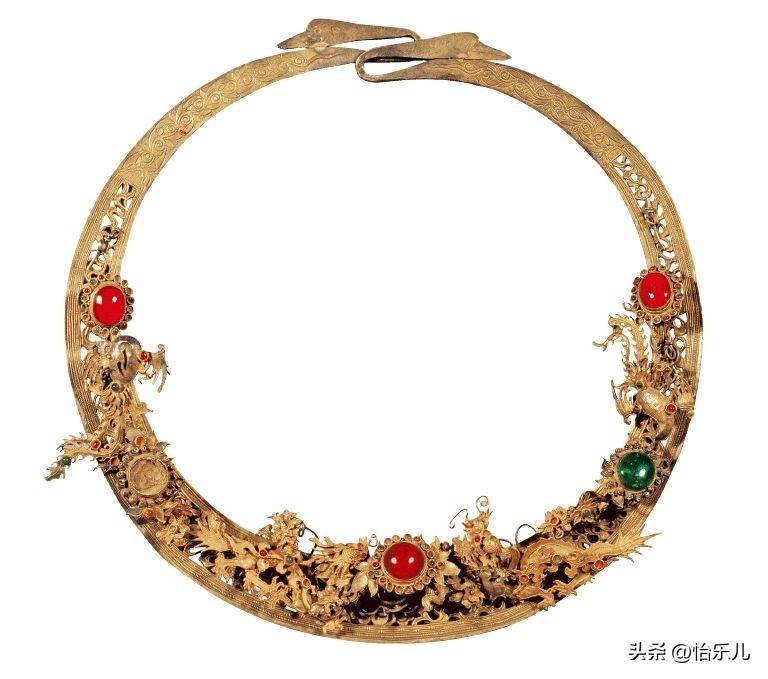 通体以银片打制为底,正中焊接立体二龙戏珠图案,配以双凤,镶嵌红、绿色料珠,其中大颗料珠四枚,小粒料珠若干,项圈两端尾部收口处做大雁形,极具动感,底部银片镂空并錾刻几何纹、缠枝纹。