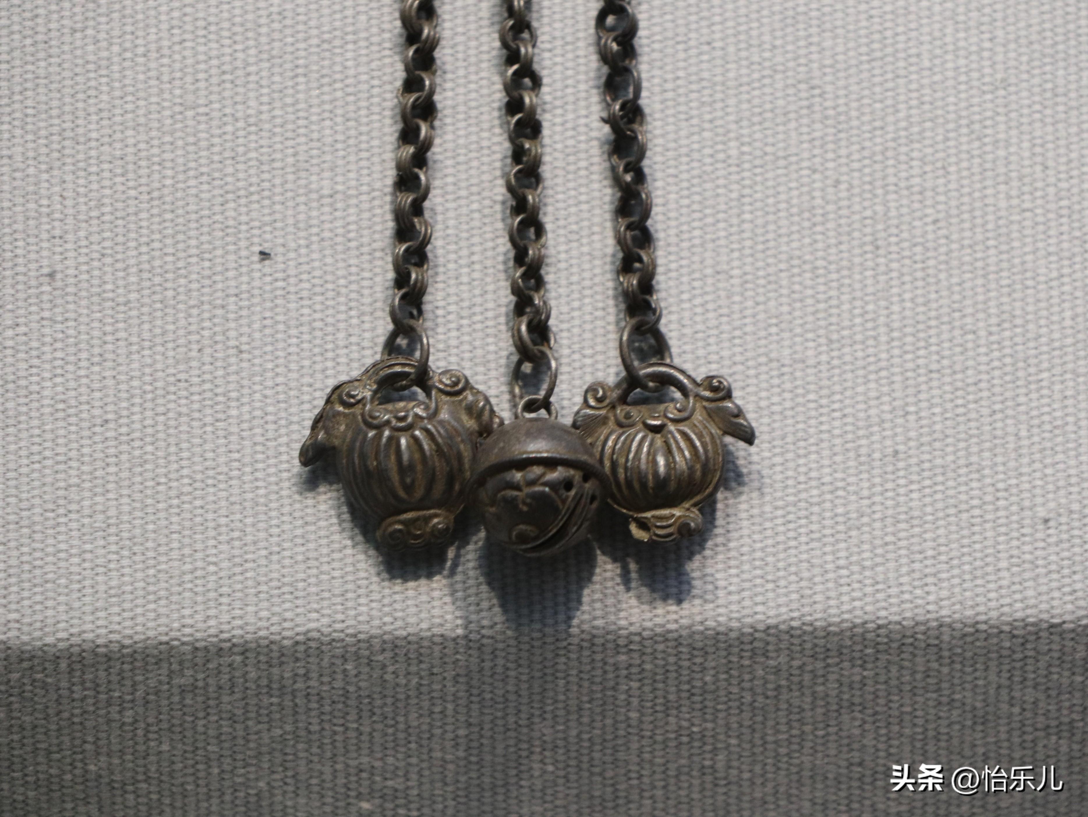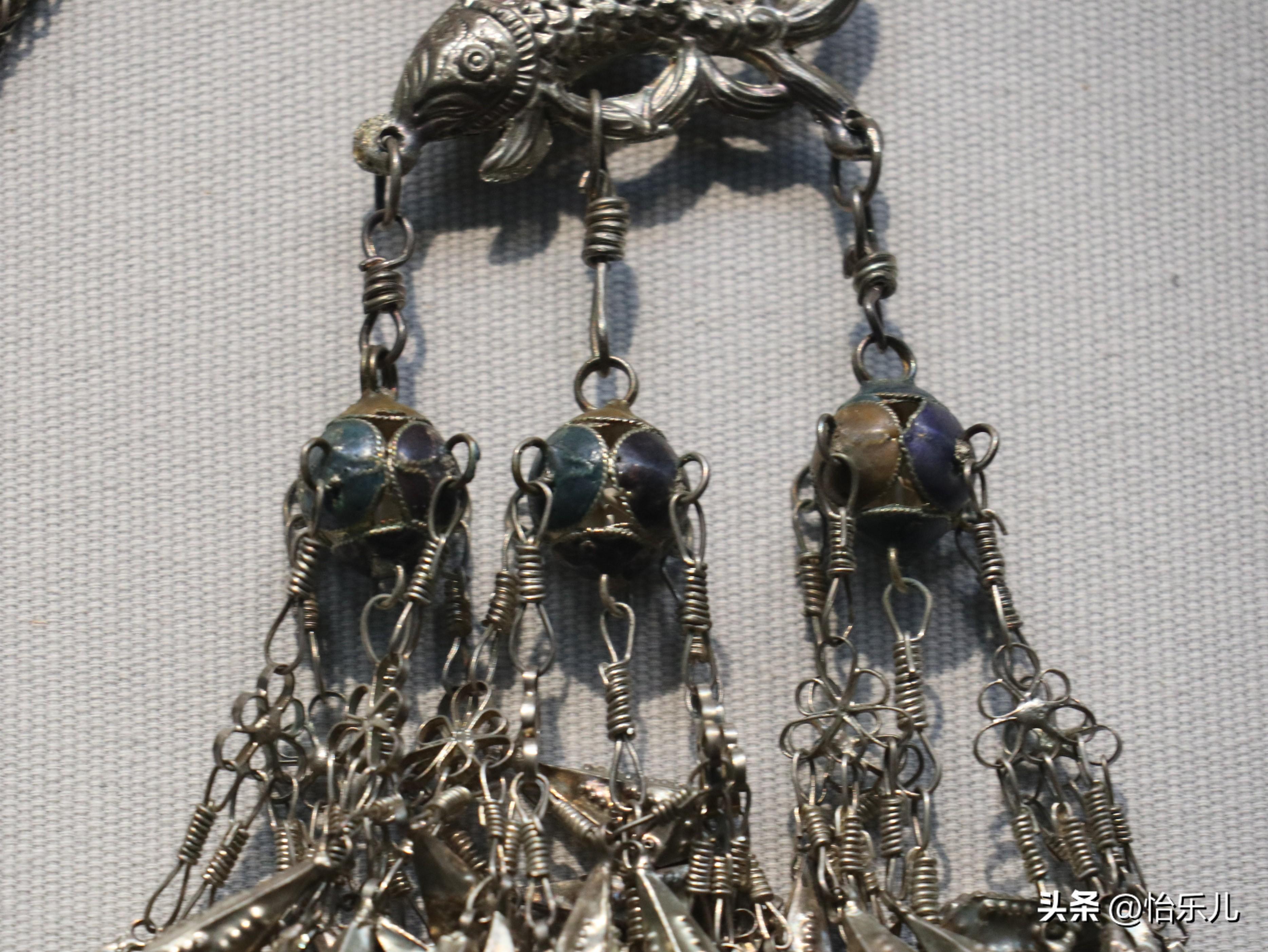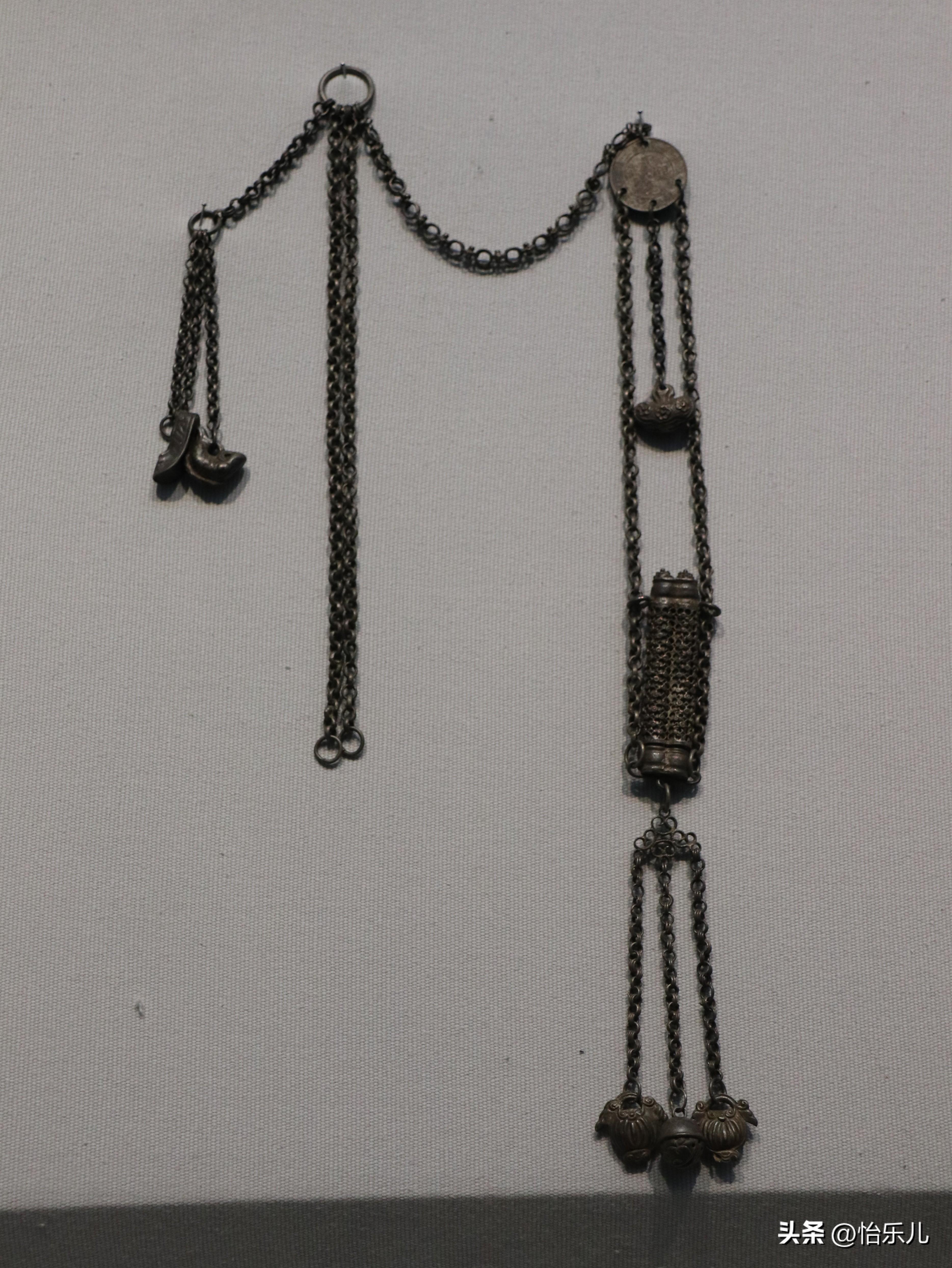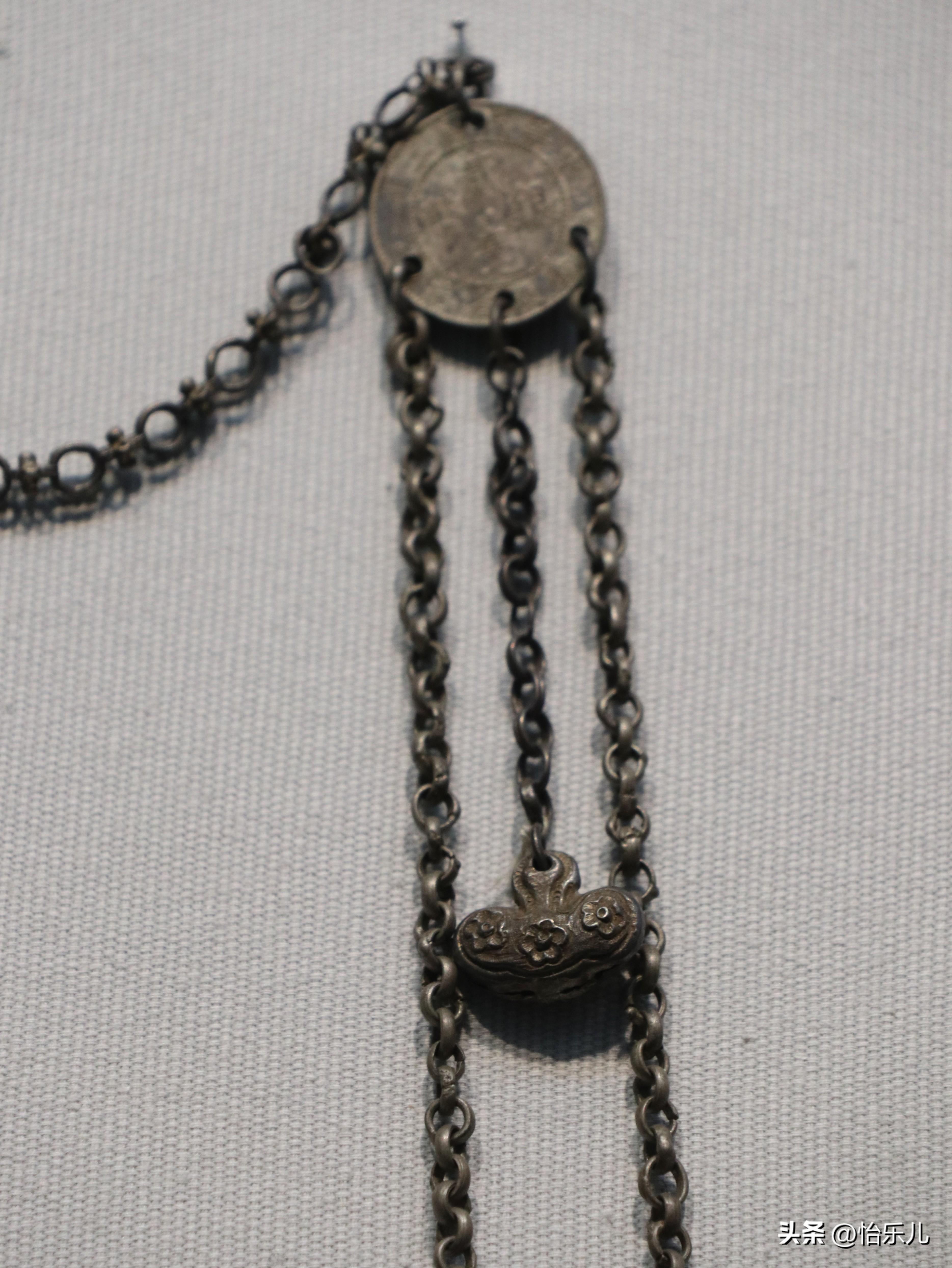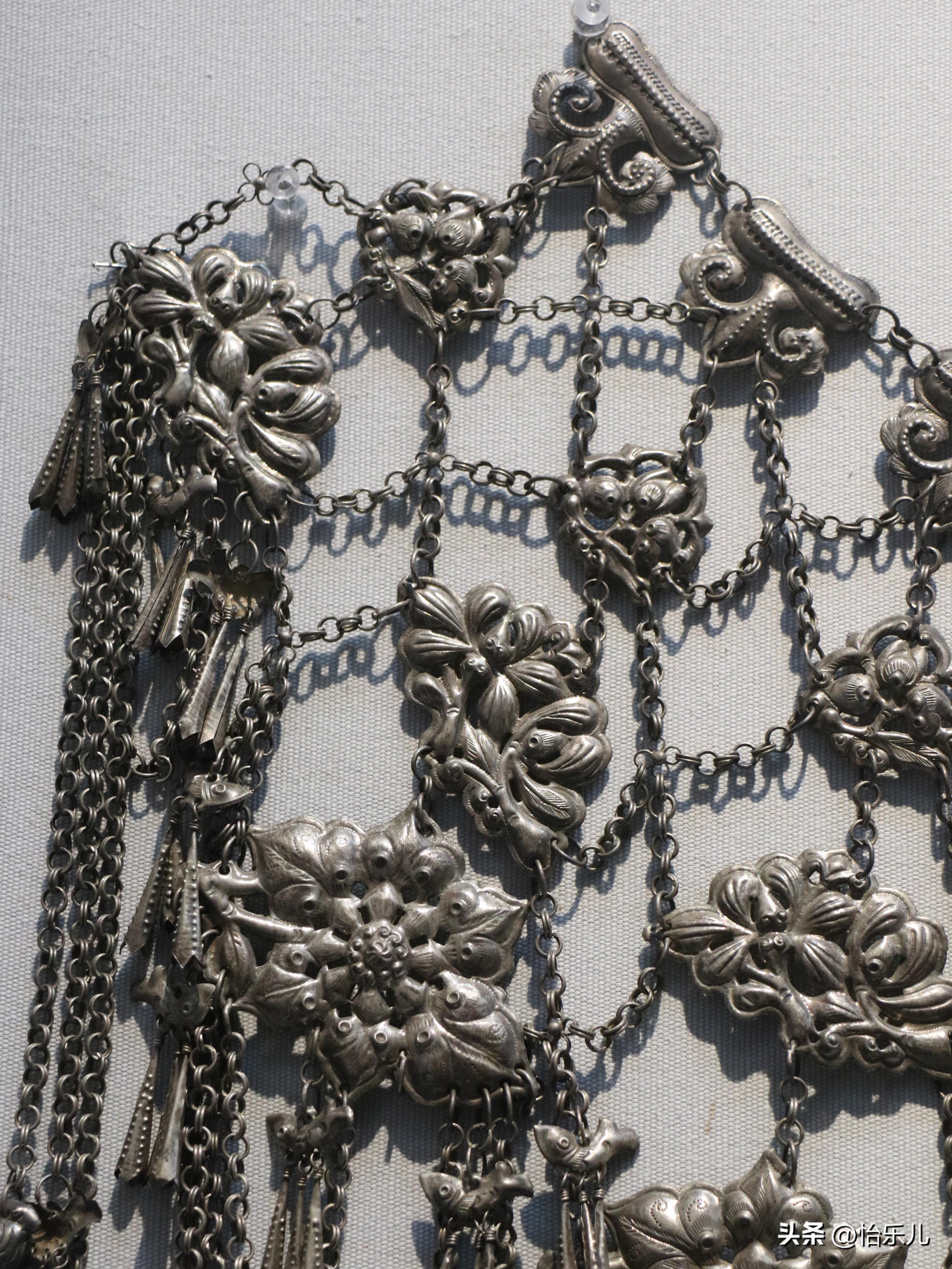 花草、动物等吉祥图案4排银牌相缀连,工艺复杂,构图巧妙。其下扣缀有长长的链坠,底端缀有小鱼、佛手、石榴、铃坠等,披在身上随着身体的摆动而摇曳铃响。