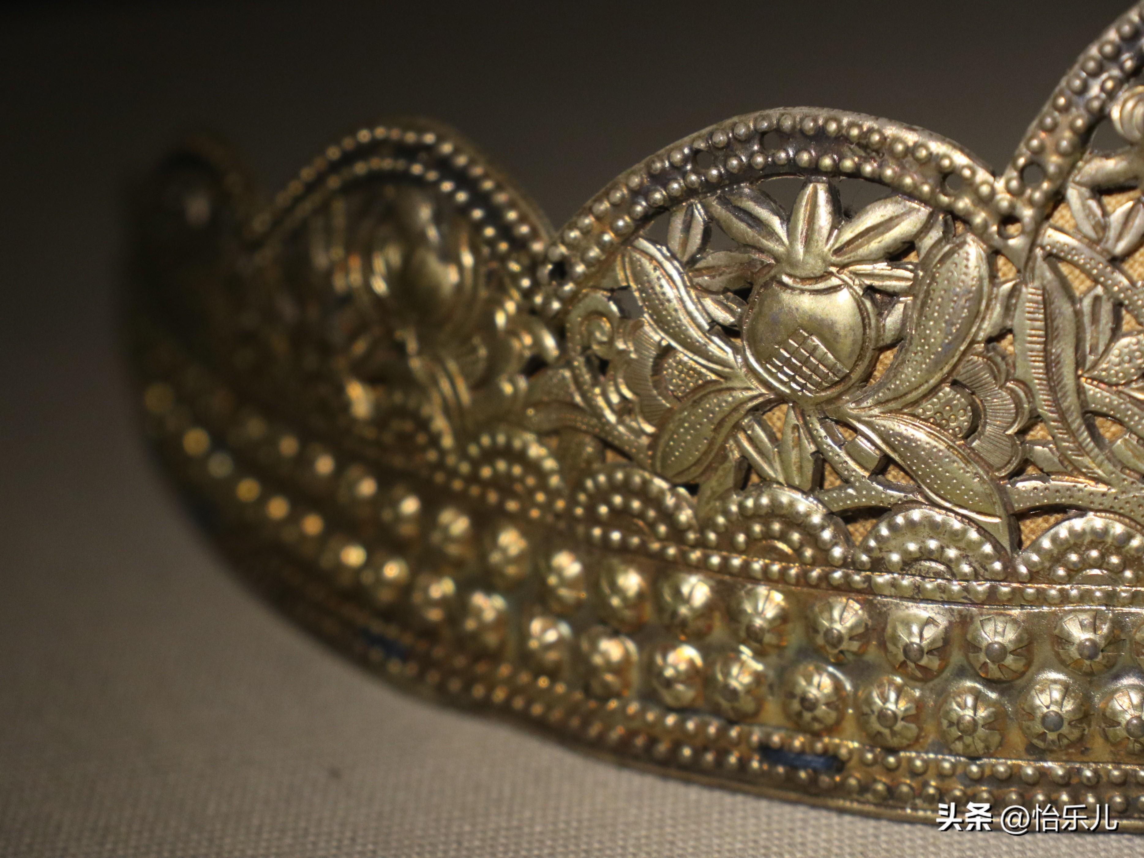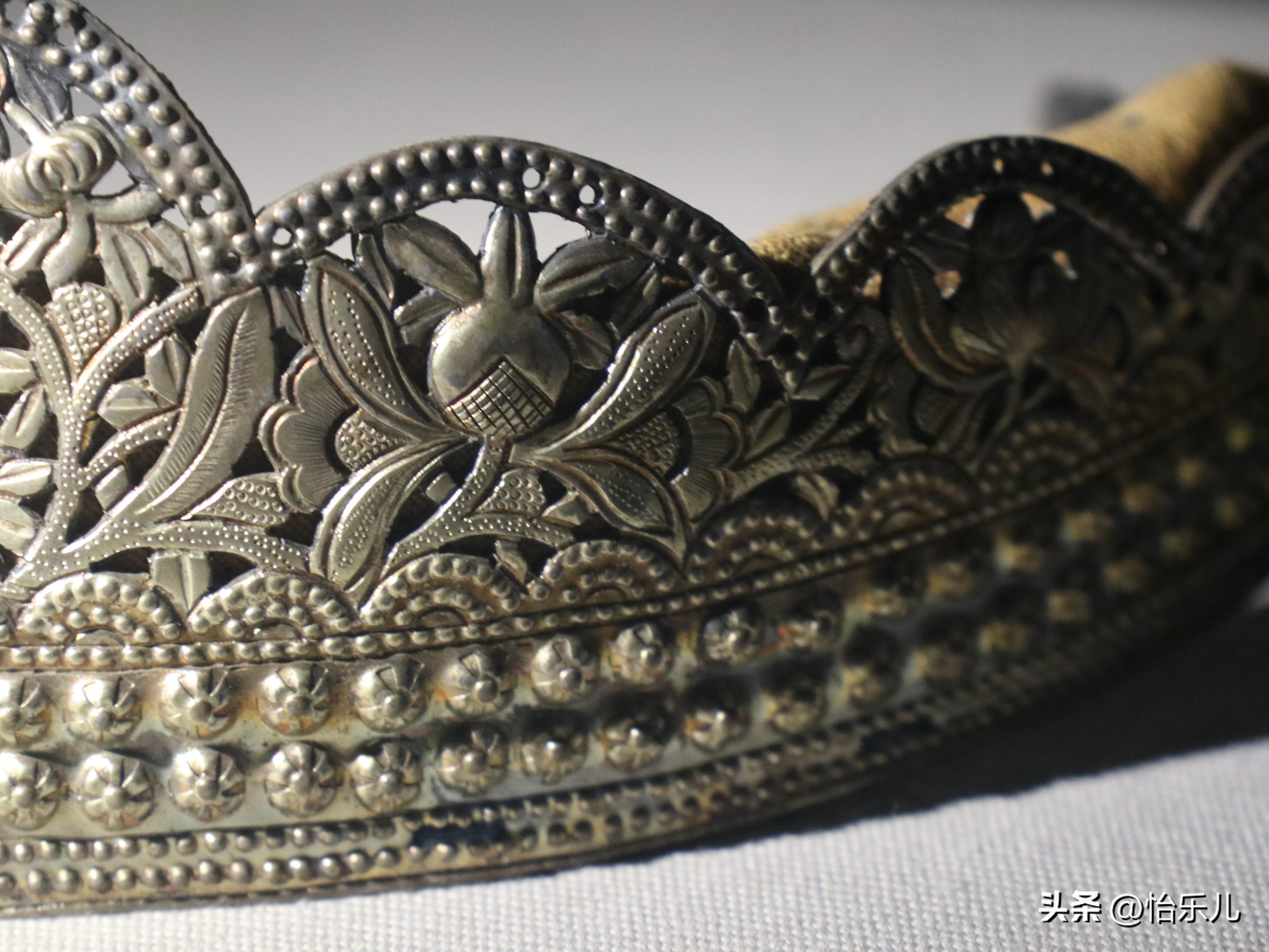 蓝黑布为内衬,外围一錾花银箍呈莲花形,其面镂空并有錾花,有楼宇、双鱼、石榴、花卉、枝叶、乳钉纹等纹饰。此帽饰结合了 “鱼跃龙门”“石榴多子”等汉文化中常见的吉祥寓意,体现出彝族文化与汉文化的交融,表现彝族企盼人丁兴旺、子孙光宗耀祖的愿望。