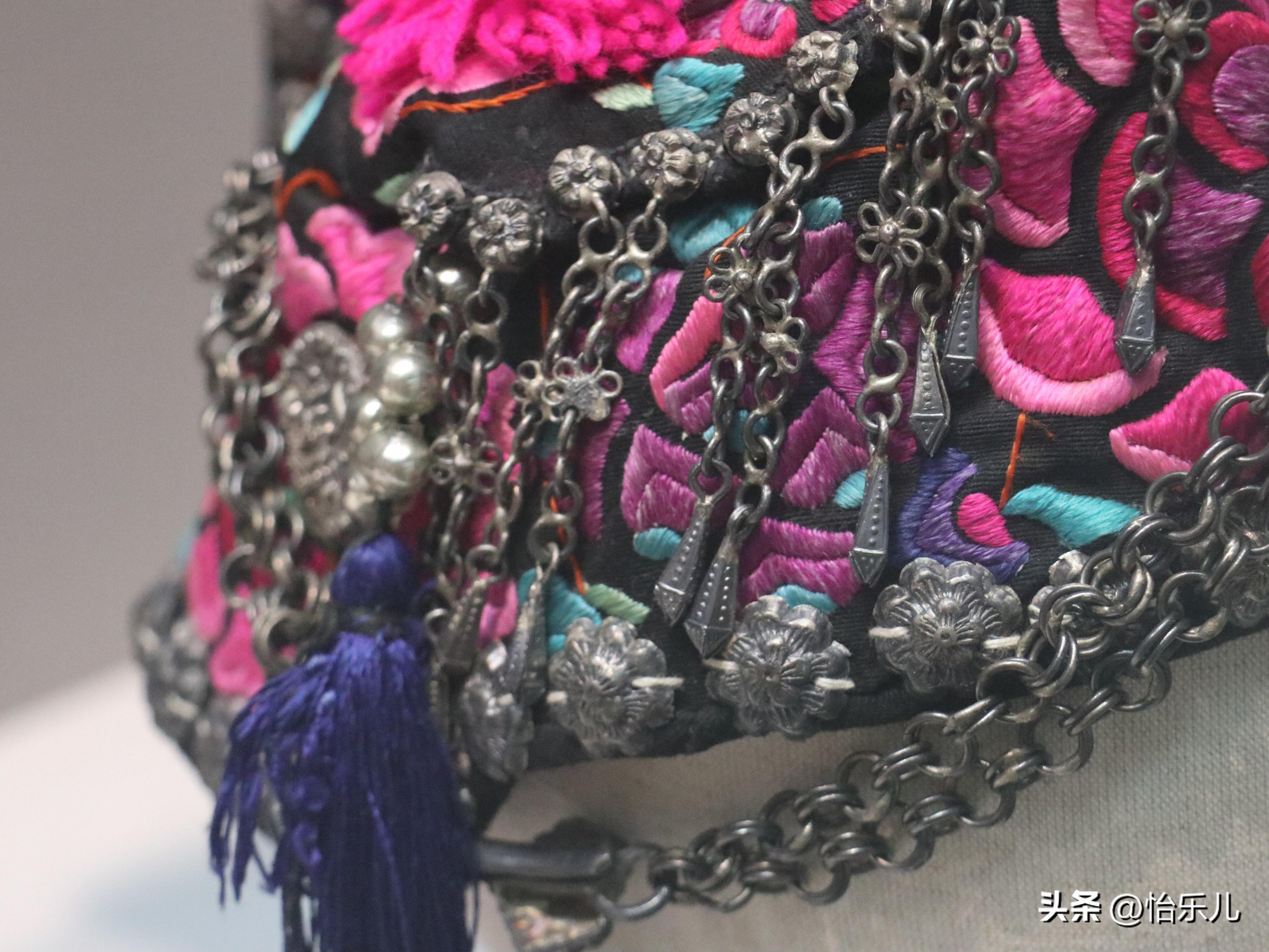 黑布两侧及前额部皆以五彩丝线绣花卉,间以錾花圆形银片为饰,其上缀两串银链,额部缀一排银链,并缀两束蓝线须为饰,帽沿镶梅花形银泡。彝族民间认为这种帽子可以驱魔避邪,把它戴在头上,能带给人们幸福、平安。