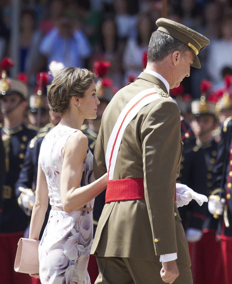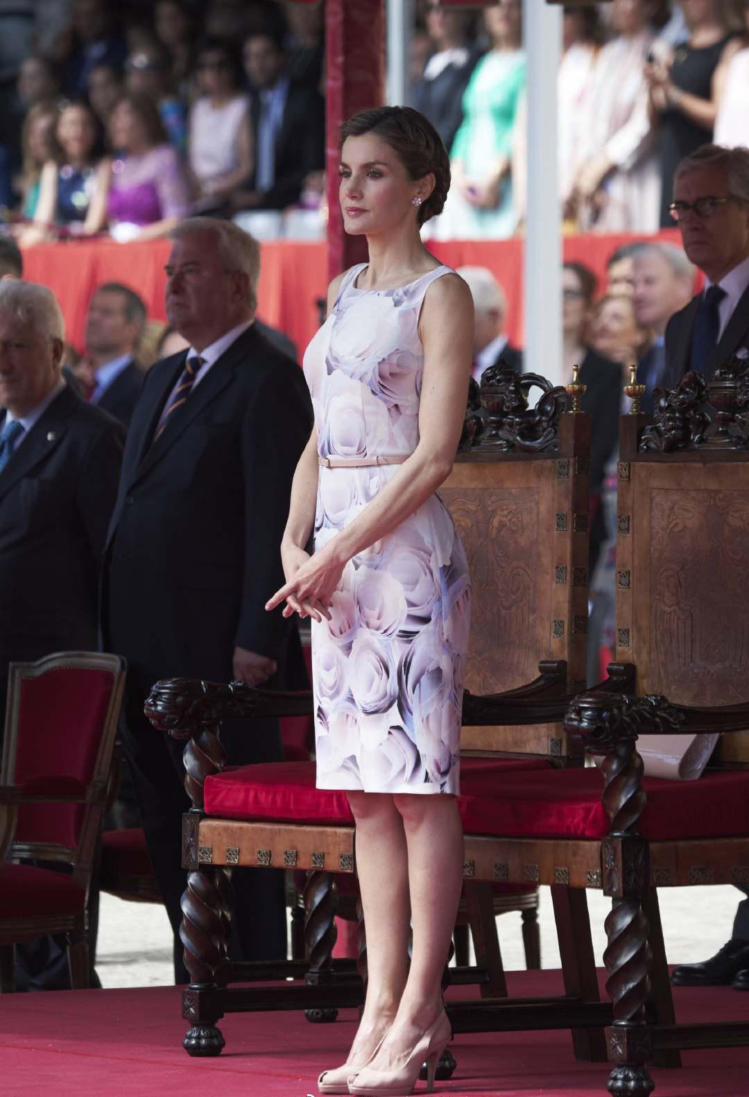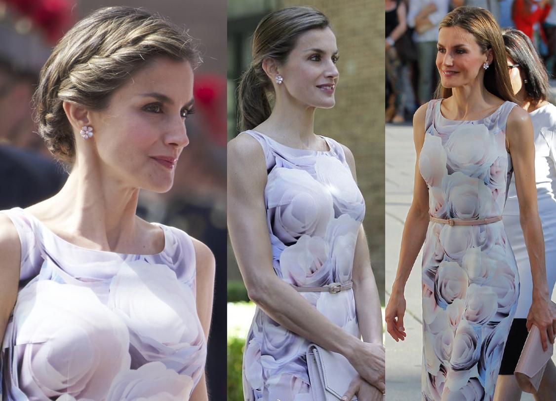 西班牙王后就是很好的例子,穿一件正装印花连衣裙搭配马尾辫,不仅仅呈现出正装的端庄、大气,还塑造出了十分利落的形象。这种利落、干练的形象,很容易让西班牙王后看起来显年轻,洋溢着干练女性的风范儿。