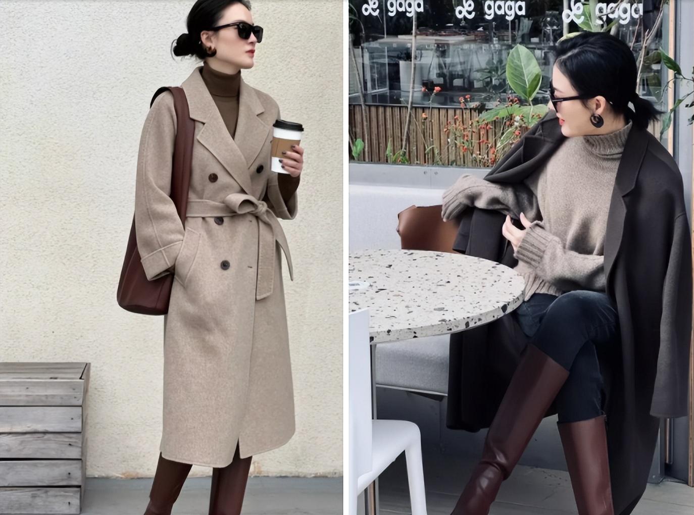 中长款大衣刚好遮掩住大部分身形的问题,而长款骑士靴又能让下半身显得更加纤细修长,整体搭配简约却高级。