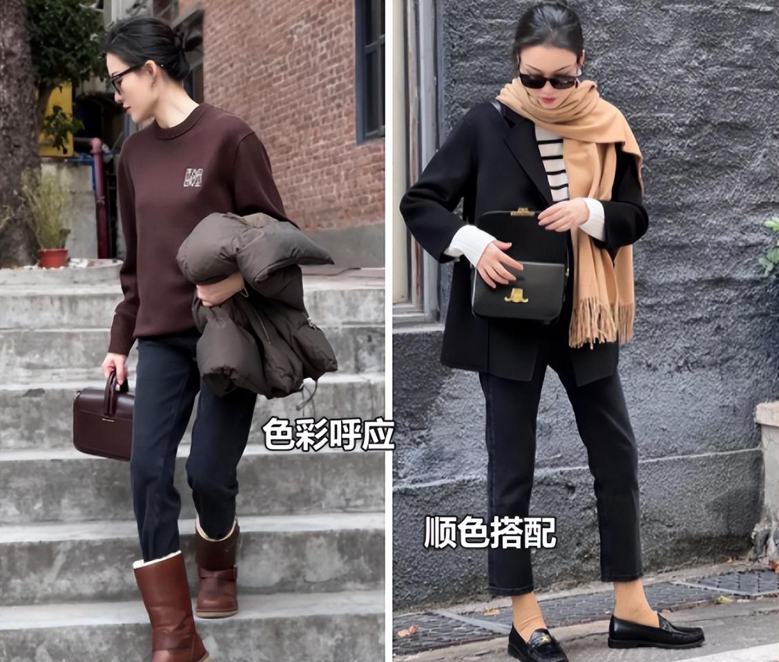 内搭与裤装构成顺色,或是利用围巾、帽子、包包、鞋子等呼应,这样可以在颜色上加强造型的连贯性,同时延长纵向线条,打造简约高级的造型。