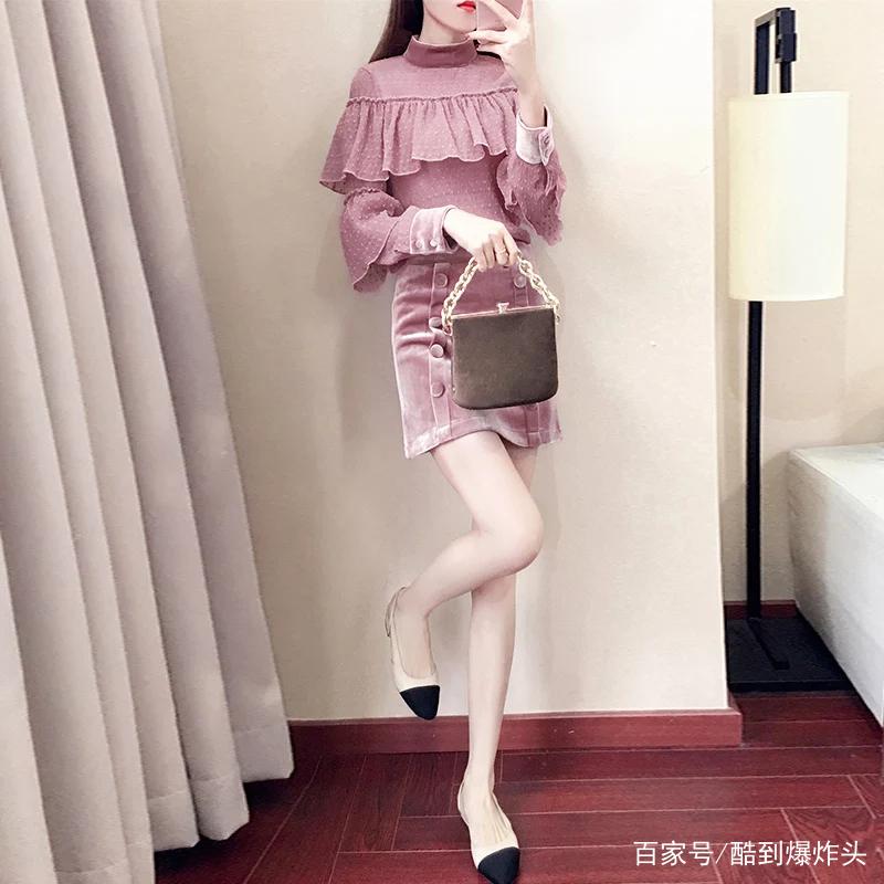 一款淑女风满满的两件套细腻的面料搭配带来新颖灵感,雅致色调表达美心心境,宛如在美好的季节里邂逅美景,透视蕾丝,上衣有着与生俱来的高雅,弥漫着若隐若现的妩媚气息,丝绒拼接半高领设计,气质优雅,显得颈脖修长。荷叶边带来浪漫情怀,蕾丝袖拼接丝绒设计,袖口增加了纽扣,穿着更加的便捷,搭配同色丝绒半身裙,朦胧的视觉尽显浪漫甜美的清新格调。约会,逛街,或是上班,都是很的一件呢!