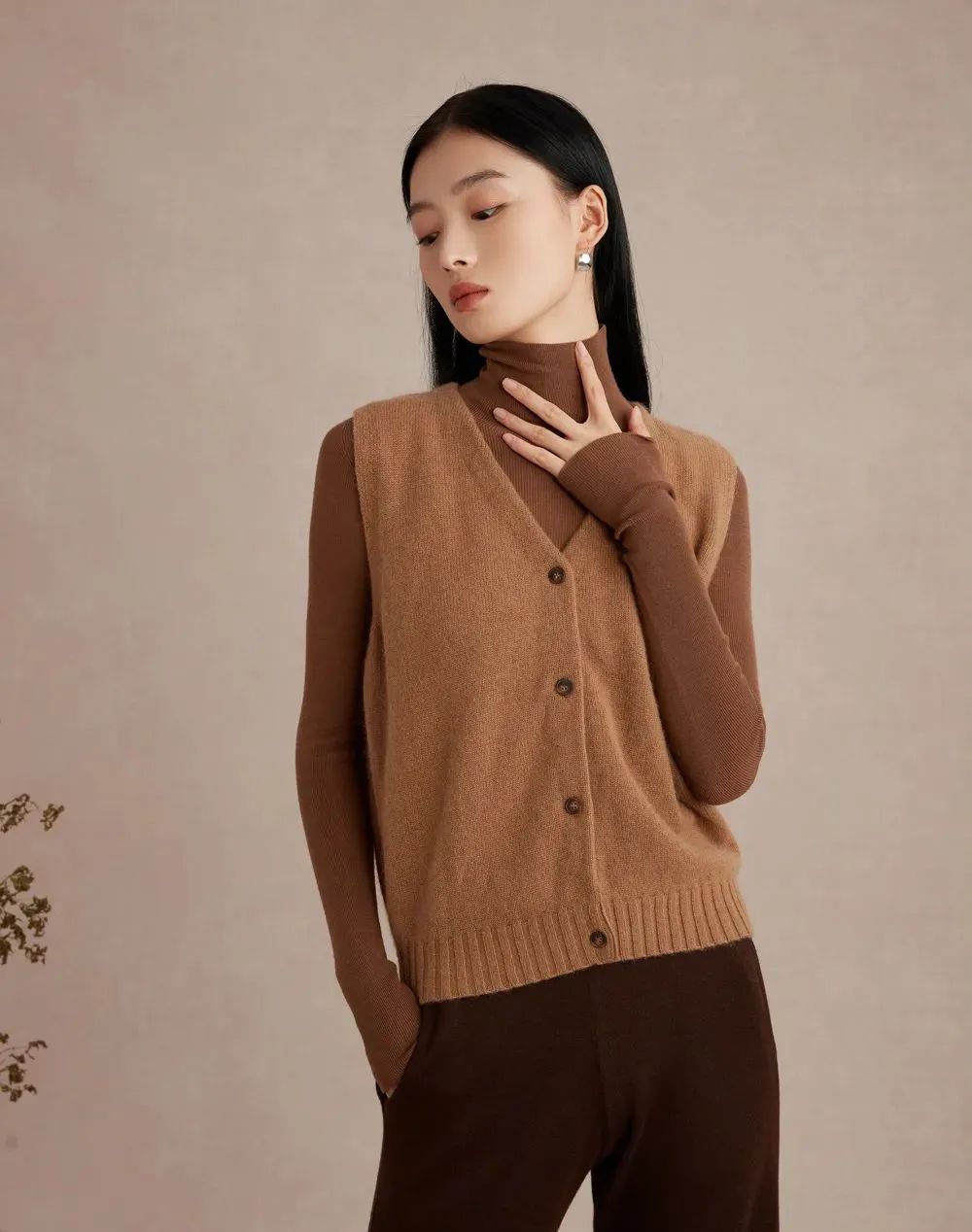 V领马甲开衫同样选用了驼绒,搭配双轨门襟的设计,编织细密,体感更加温暖柔软。开衫的颜色是今年秋冬的流行色——驼褐色,如同深秋里的一杯咖啡,细腻温暖,开衫可根据气温、场合随意搭配,气质感满满。