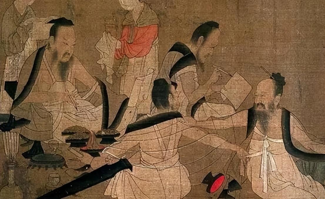 从众多传世图画看来,这种圆领袍衫在非正式场合下流行一种“潇洒穿法”:不合颈下胸上的一段,让袍子前面的一层襟自然松开垂下,形成一个翻领的样子。这也算向胡服中的翻领靠近,也确实达到了与胡服相仿的果。用今天的话说,大概就叫显得洋气。