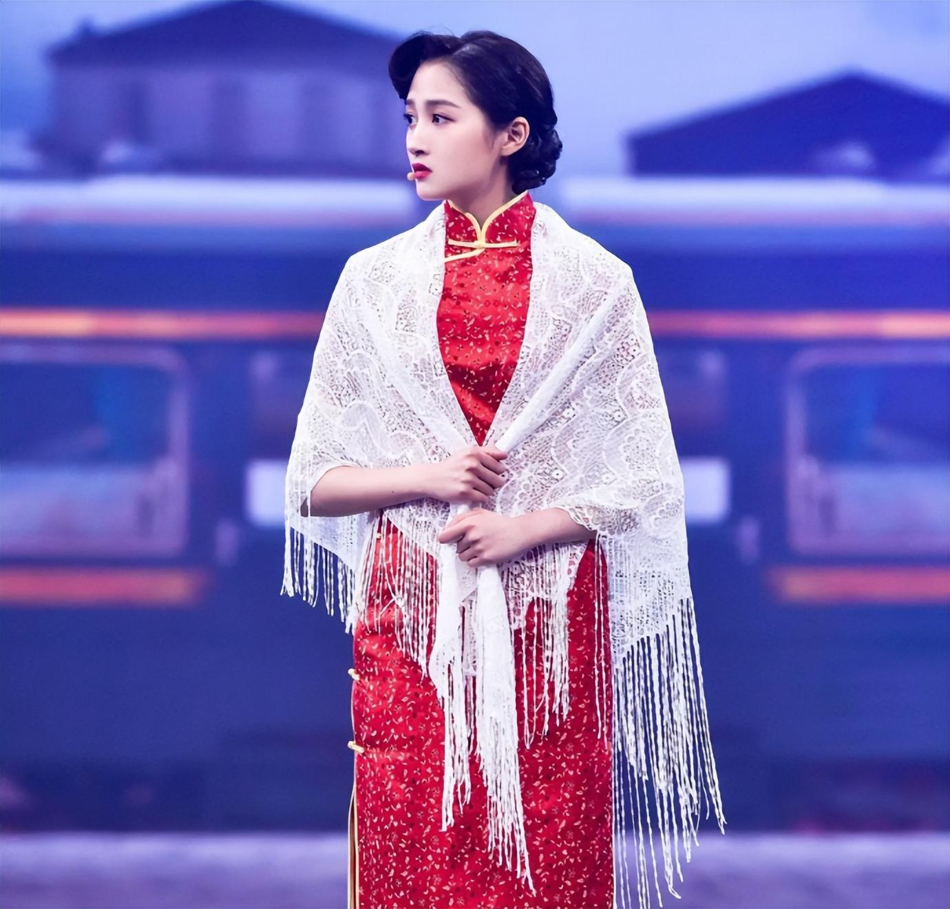 因为综艺和走秀要求,她曾留着大波浪卷,披着披肩,穿着一条红色的旗袍亮相。