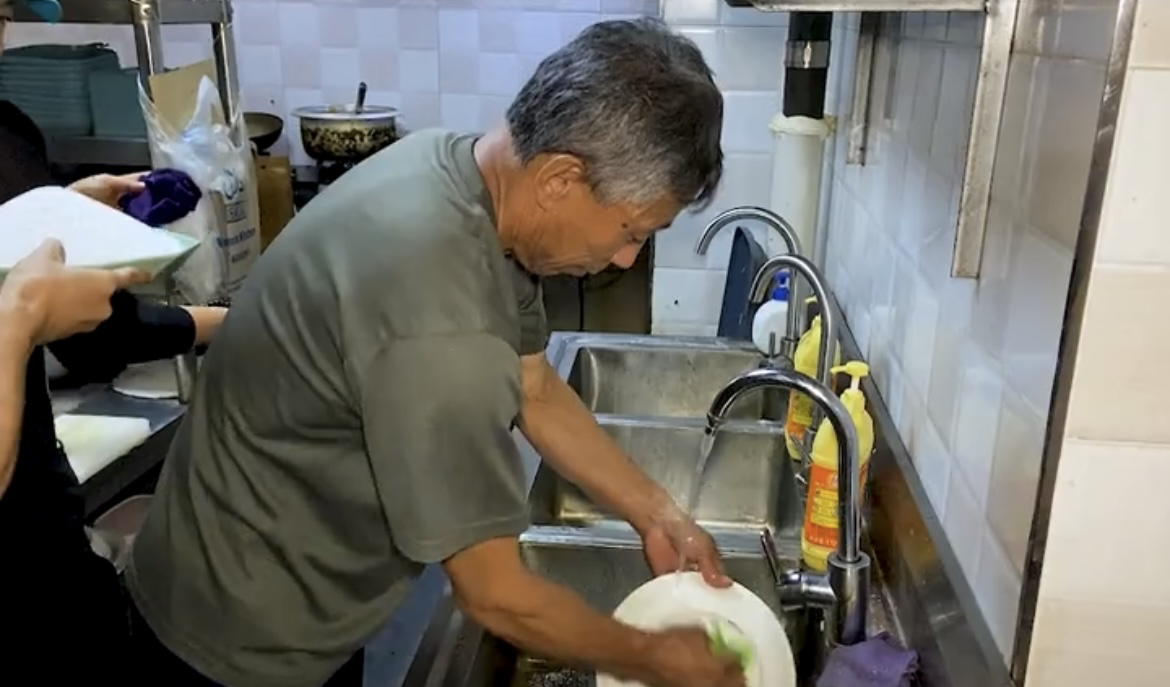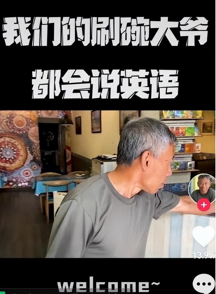 有一天,堂弟把镜头对准了周大爷。他不明白大侄子举个手机在干啥,爱搭不理,像往常那样刷碗,摆放桌椅,招呼客人。没过两天,一条“我被后厨刷碗大爷上了一课”的抖音火了,点赞过万,年轻粉丝们喜欢周大爷朴实无华的样子,积极勤恳的生活态度,更喜欢他欢迎客人时那句大碴子味儿的“围儿康姆(Welcome)”。