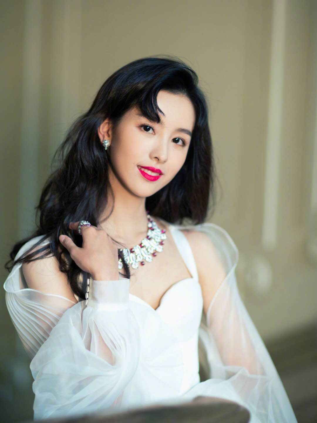 白色的网纱一向能给人干净的感觉,陈都灵的这一款白色的吊带内搭有一定的复古气息,吊带的肩带比较宽,抹胸设计的很有弧度感。这款外套网纱又结合了灯笼袖,的欧美范宫廷复古服装,不过在一定程度上结合了现代元素。这款饰品的复古感就更强了,红色宝石搭配钻石,配合花朵的元素的花瓣项链,这个感觉爱!