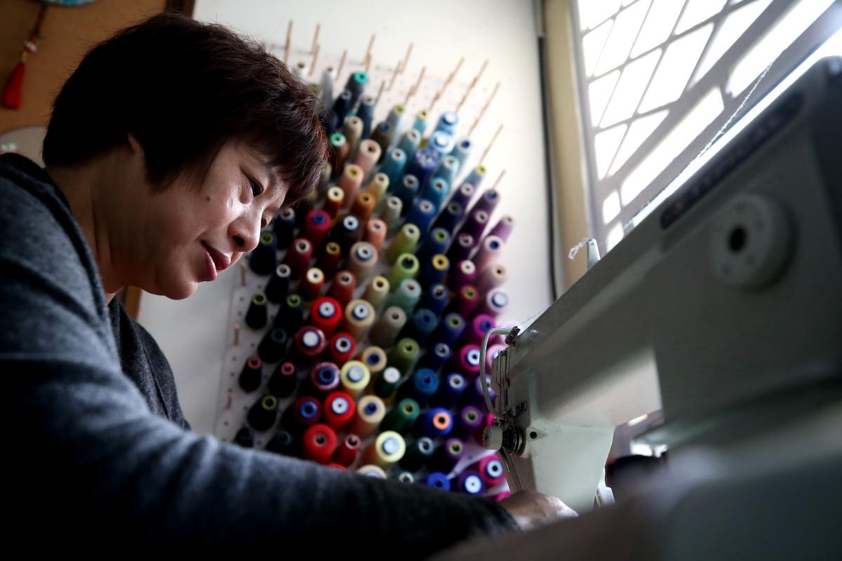 从打样到裁剪,张凤兰都亲自动手制作。墙上百余个色彩斑斓的线轴可满足各色旗袍的缝制要求。