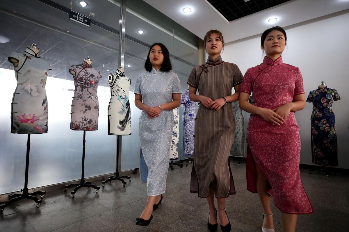 外出表演展示的旗袍缝制出来后,还需要模特穿在身上观看果。