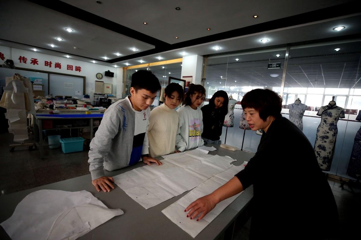张凤兰作为黄庄职业学校的老师,为学生们教授京式旗袍的打样要领。