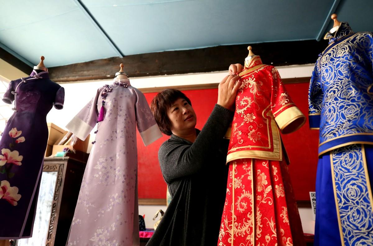 张凤兰为获取灵感,经常到外面采风,碰到感兴趣的题材就用手机拍下来,回来后在加上自己的感悟,画在纸上作为旗袍设计元素。