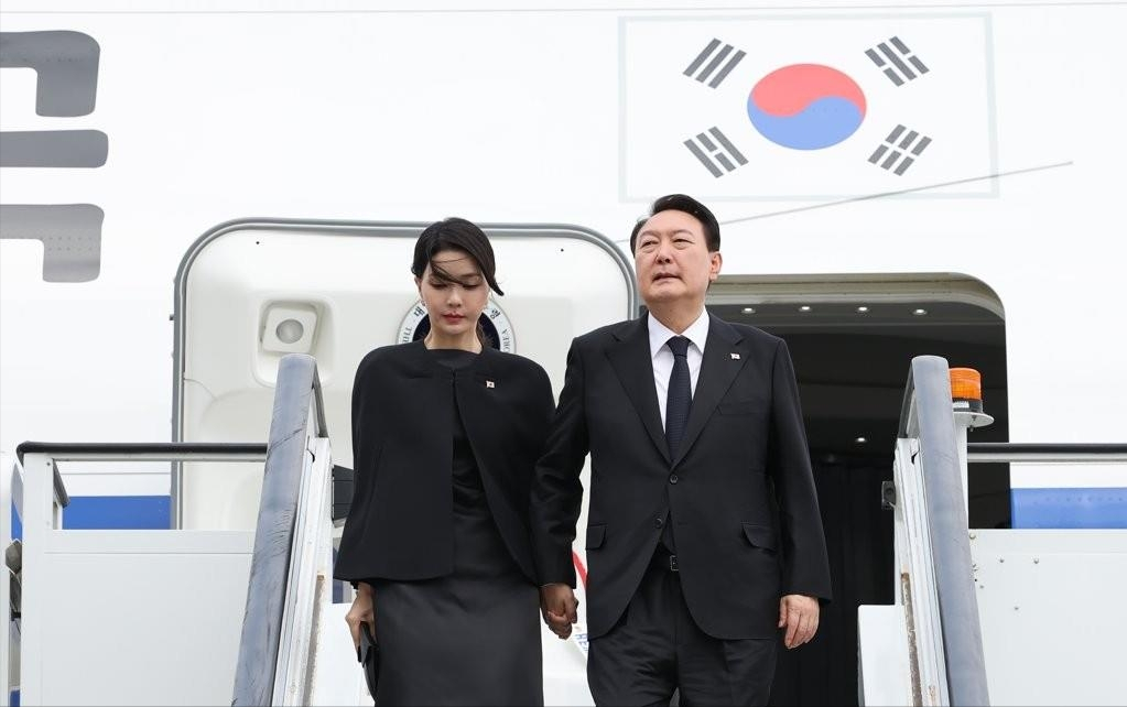 韩总统夫妇也去参加女王葬礼!金建希穿黑裙像少女,赢了雅子皇后