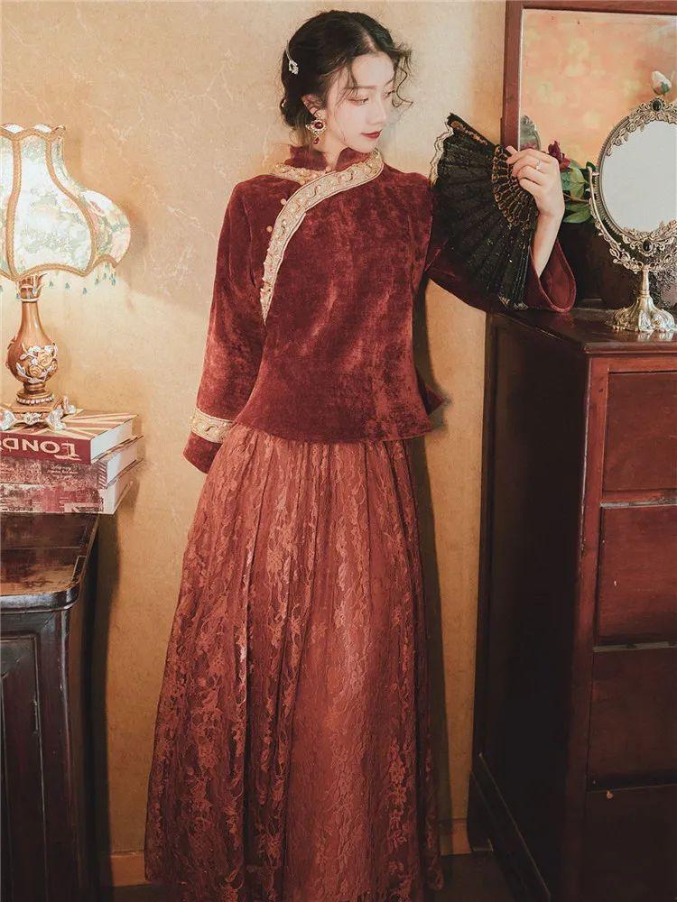 民国时期的袄裙呢,上袄的领子是比较高的立领,衣襟是斜襟的样式,就如同旗袍一样。然后,上袄的袖子是比较宽松的,可以很好地遮住手臂上的肉肉,又能露出纤细的手腕,是显瘦的。