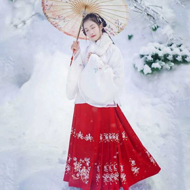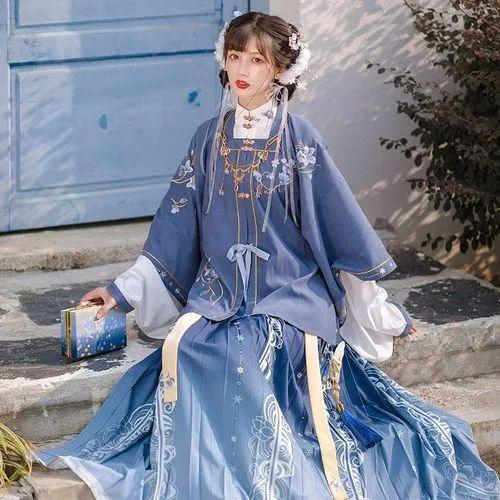 大家在穿着明制袄裙的时候,一般都是成套来进行购买的,这样上面的绣花图案会更加地协调一些。至于上袄是选择长袄还是短袄,这个就靠大家自己去搭配啦。