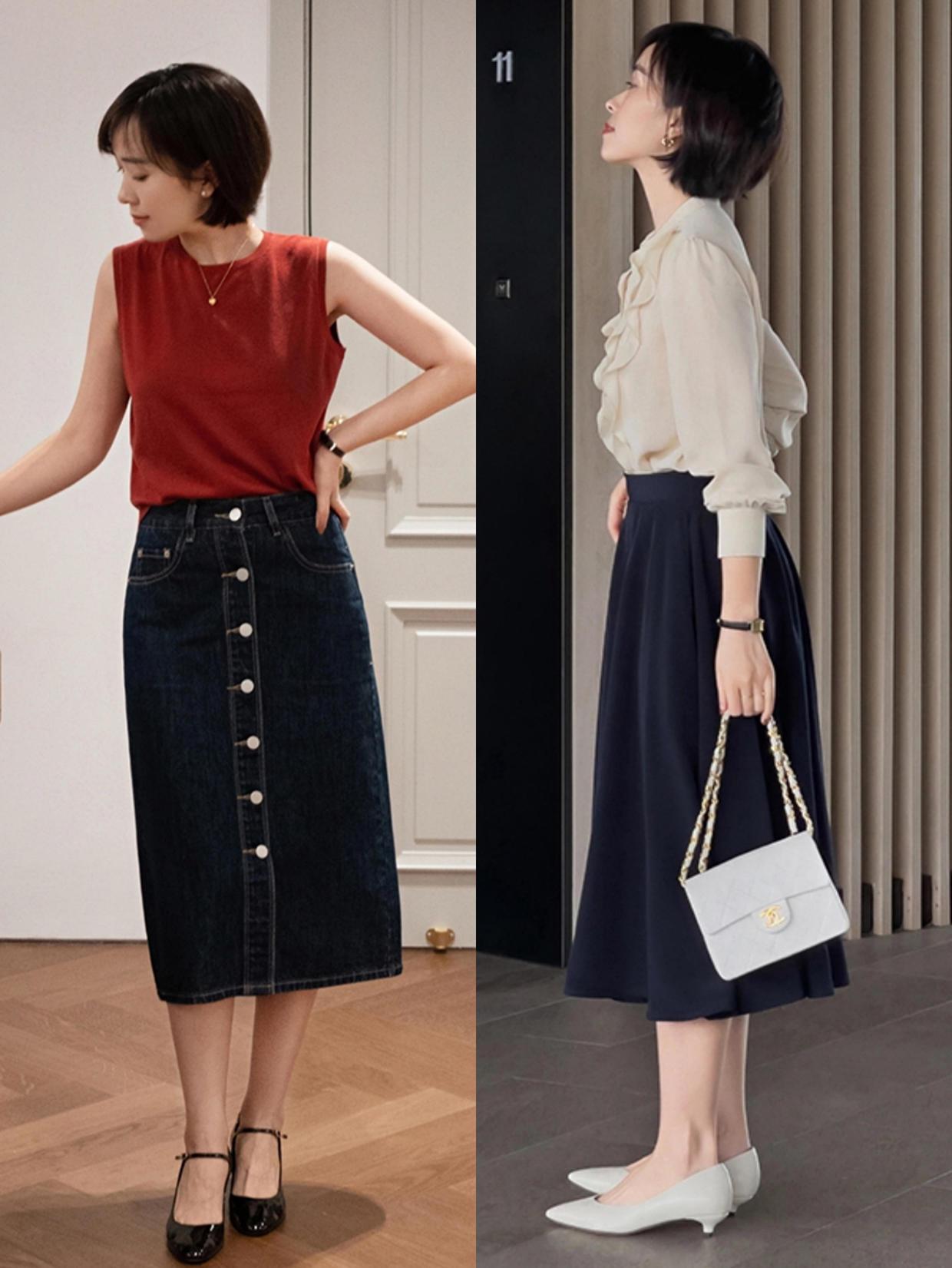 第二,知性美的搭配解析夏天想要打造出知性美,首先你可以用这些中长的裙装去搭配各种短上衣,从而调节我们的身材,这样的造型看上去也会很有韵味,像这些修身的短上衣配上高腰的半身裙也都是有气质的,低调又时髦。并且还可以用这些极具女人味的服装来增强魅力,约会的时候推荐大家可以多试试。