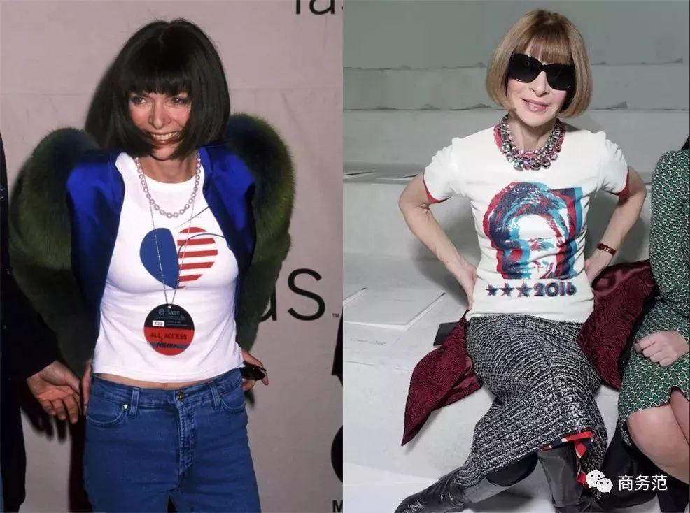 当然,有时候她也会用上印花T。简单的图案+牛仔裤,是走休闲风的时尚编辑,而在Chanel套装下,穿着由小马哥亲自设计的“政治”指向T恤(右),则是说话有分量的“魔头”主编。