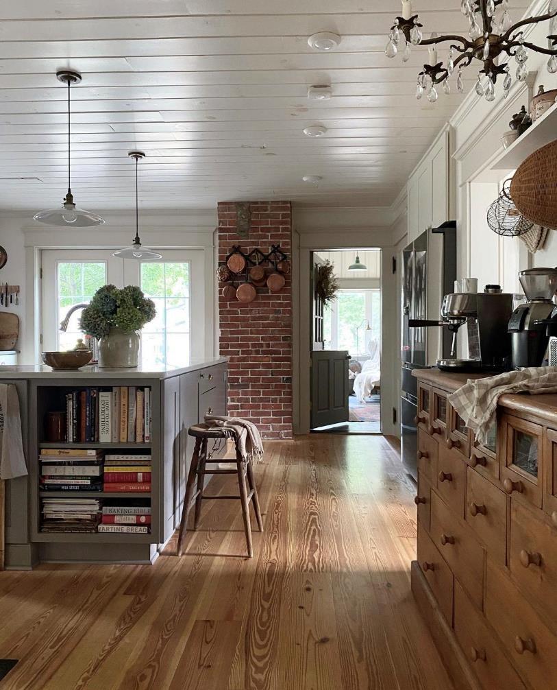 美式家居里经常看到的就是大厨房了。这个家也不例外,厨房占据了很大的空间。而且厨房里烹饪区、烧烤区、咖啡区、中岛吧台一应俱全,还看着宽敞,保留了一些些红砖墙,弧形拱门,老式家具以及木地板等有些混搭,就像是浪漫的地中海与自然的美式田园的结合。