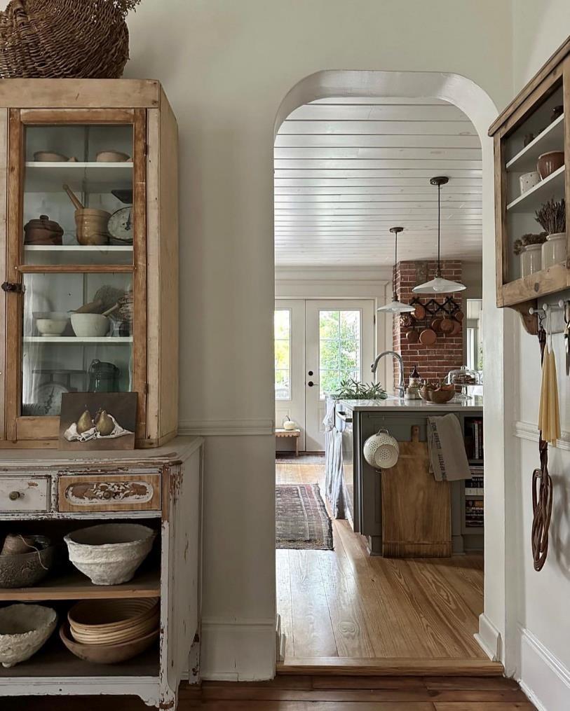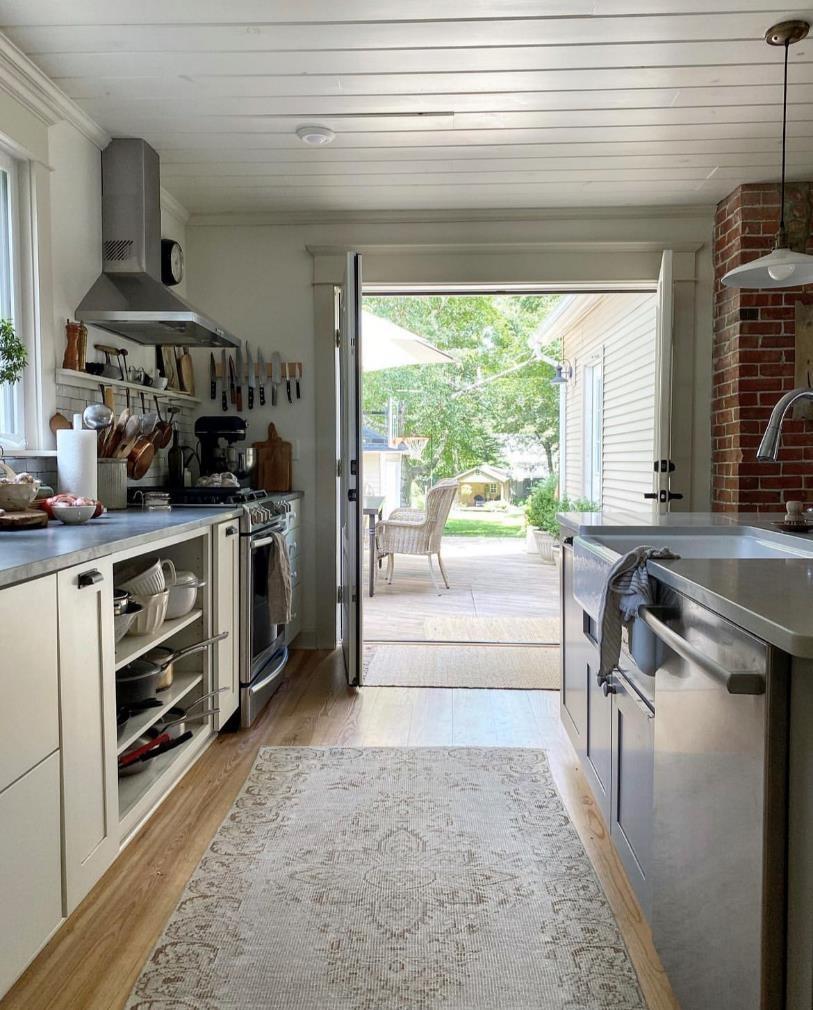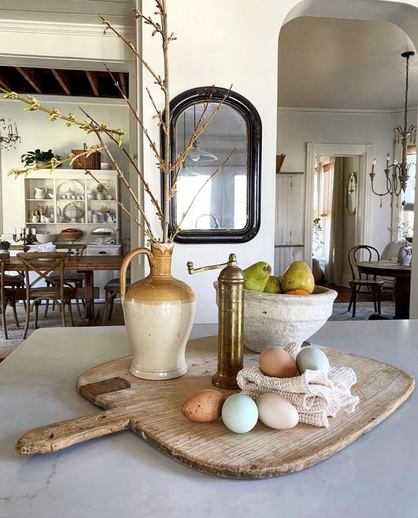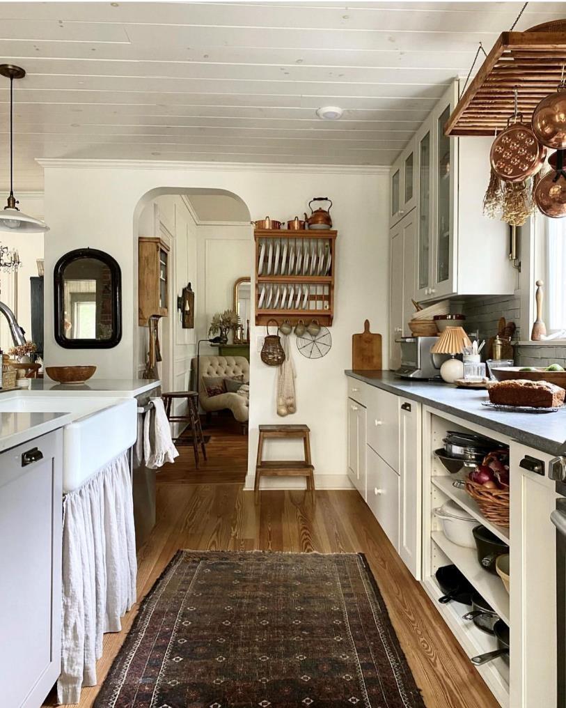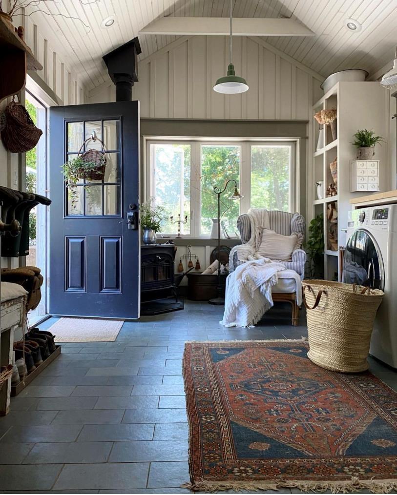 厨房和洗衣房也是相通的。这里原本也是生活空间的入口,因为空间足够宽敞,打造成了一个洗衣房。为了凸显当下的季节,女主人把南瓜、干花、地毯还有柔软的纺织品都派上了用场。这也告诉我们,季节性家居氛围的营造也可以不用花钱买装饰品。