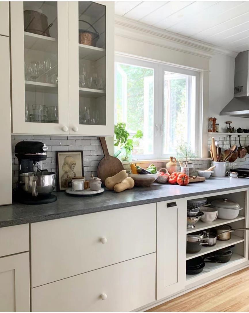 橱柜是家里现代感的家具了。白色柜体搭配黑色人造石台面,整体简洁大方,更像是北欧风格。隐藏式、开放式储物同时拥有,而且还有个宽敞的中岛台,真得非实用了。