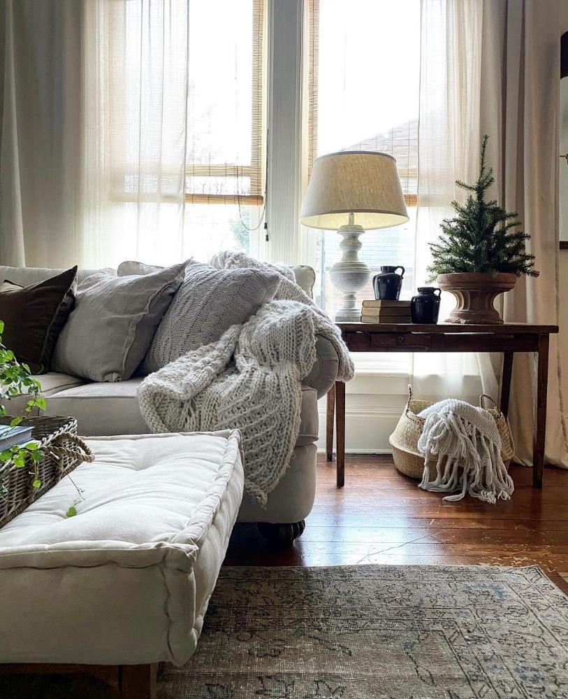 沙发算是为数不多的新品了,米色调温柔耐看,经久也不容易过时,抱枕套和垫子是女主人大多女主人亲手缝制,搭配上其它淘来的物件,有种独树一帜的温馨格调,也温暖。