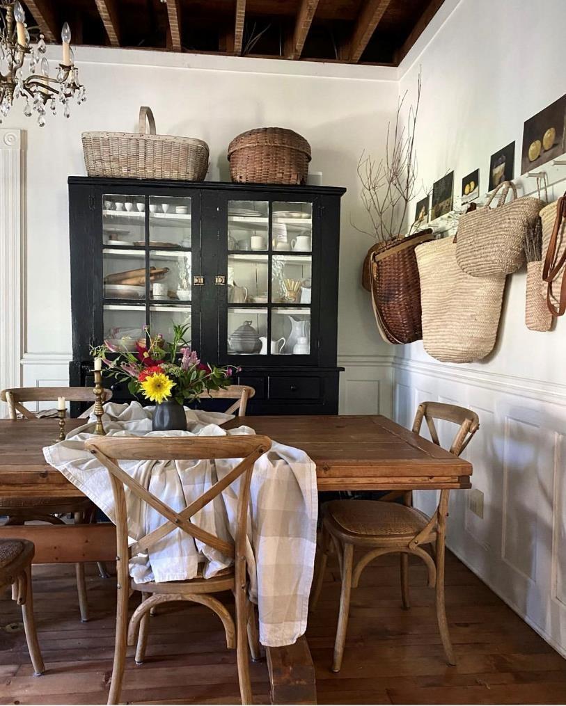 穿过咖啡区就来到了餐厅。依旧看不到华丽的新物件,老旧的木板做成的长桌,还有经过处理后的木质餐椅,以及刷上黑色漆的玻璃餐柜,透露着一股怀旧乡村的气息。原本的护墙板已经涂上白漆,木横梁也经过清理和维护,保留着质朴的气质。