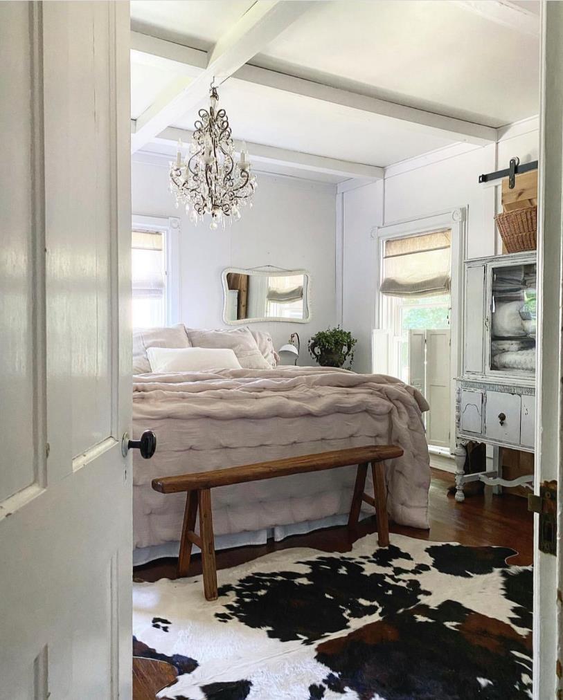 主卧是一个通透的空间,窗户虽小但是多,木横梁天花板也刷上白漆后整个空间很亮堂。依旧是老家具占据主角,一盏水晶灯带来旧时的荣光,旧衣橱上斑驳的痕迹就是岁月的证明。
