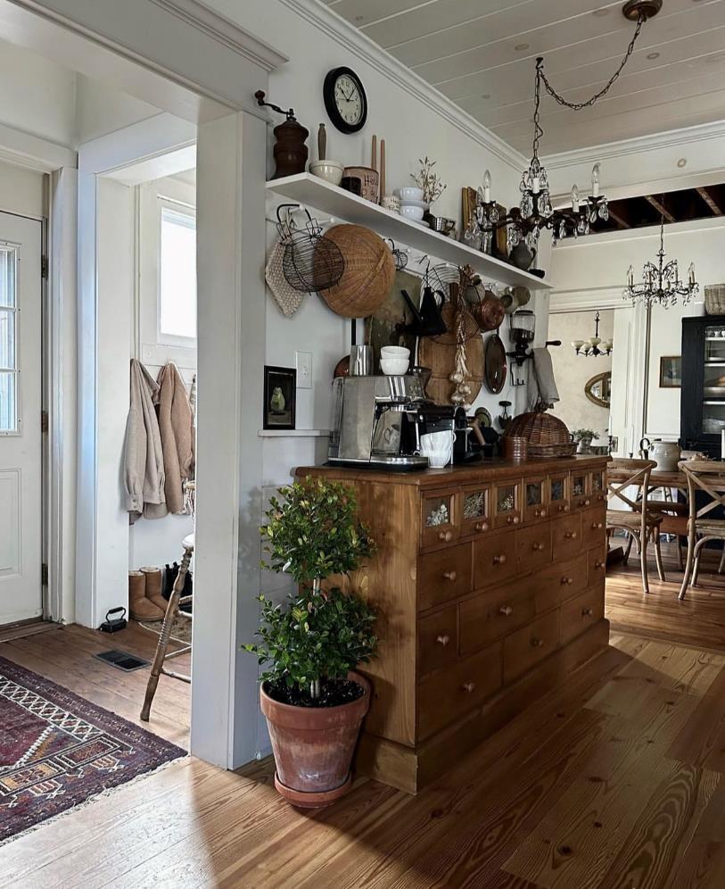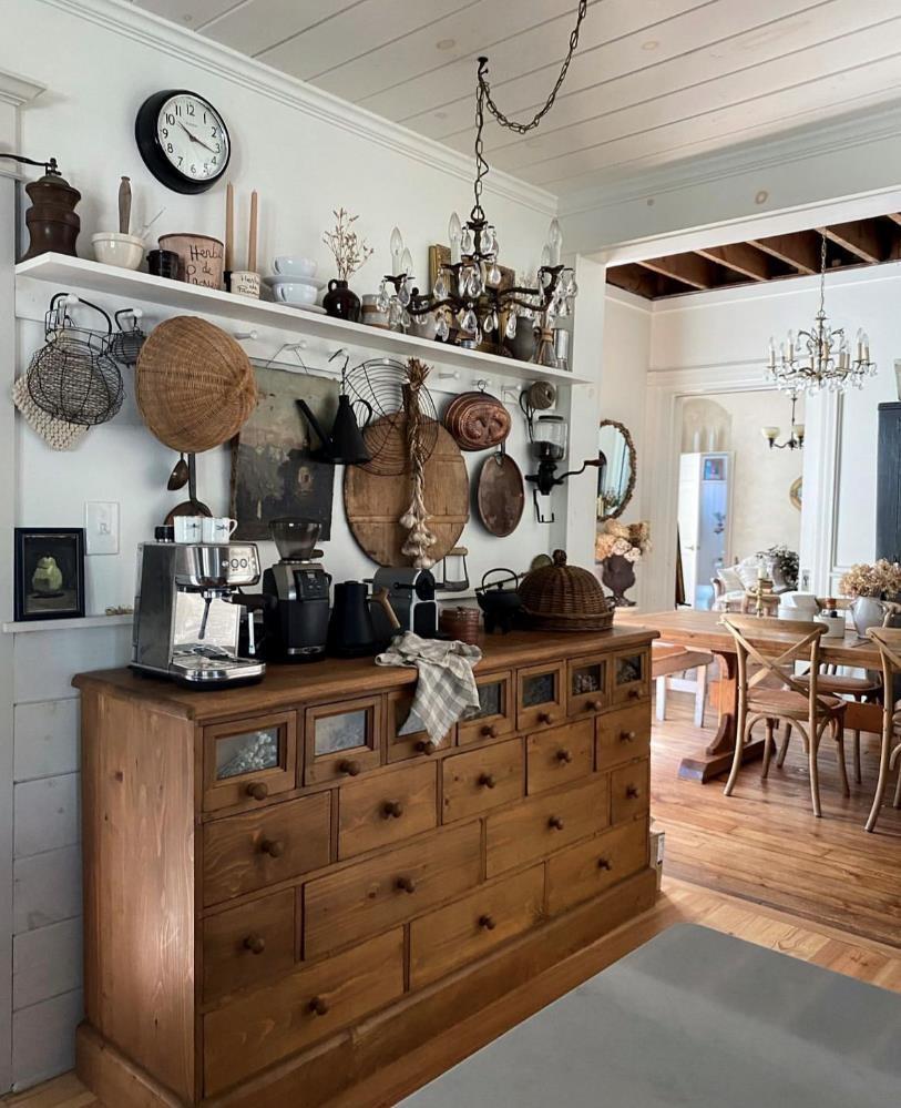 从这个角度也能看到,厨房的四通八达。这里还有一个侧门,从侧门直通厨房、餐厅,和厨房相连的这面墙变成了一个咖啡角,老式的抽屉柜,满满当当的厨房用品和咖啡相关的物件,显得生活气息十足。