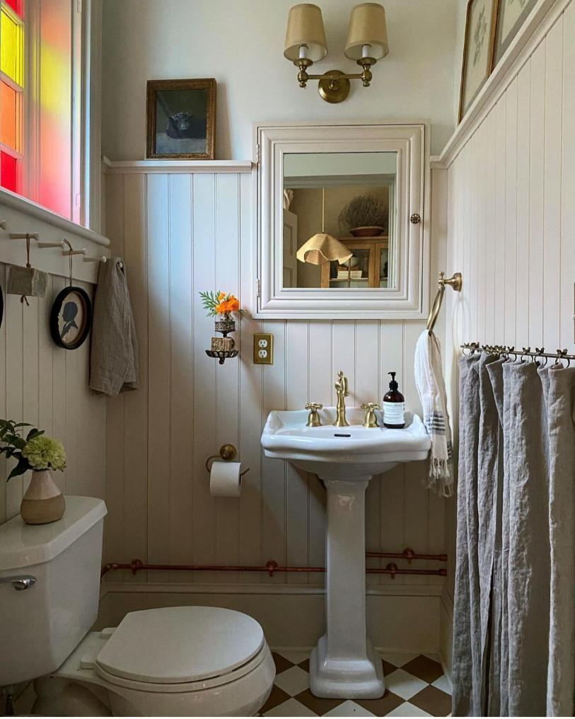 这间小卫生间位于一楼书房边。虽然只是一个小角落但也经过大修,排水和墙面自然不用说,全部翻新过,卫浴洁具也很古典美式风格,比如分体的马桶、双出水的黄铜龙头,搭配复古的菱形格拼色地砖和主人自己缝制的布帘子,可谓美式乡土韵味十足。