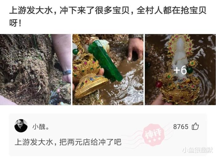 发大水了,在小河里冲出来很多宝贝,村里人都在抢呢!