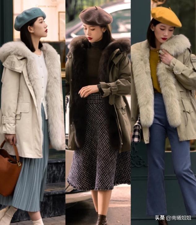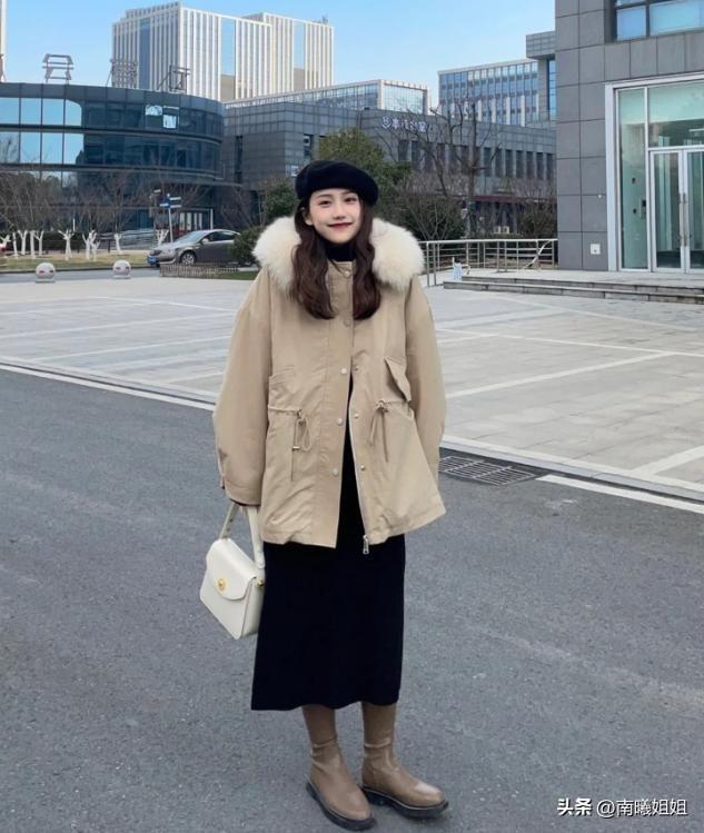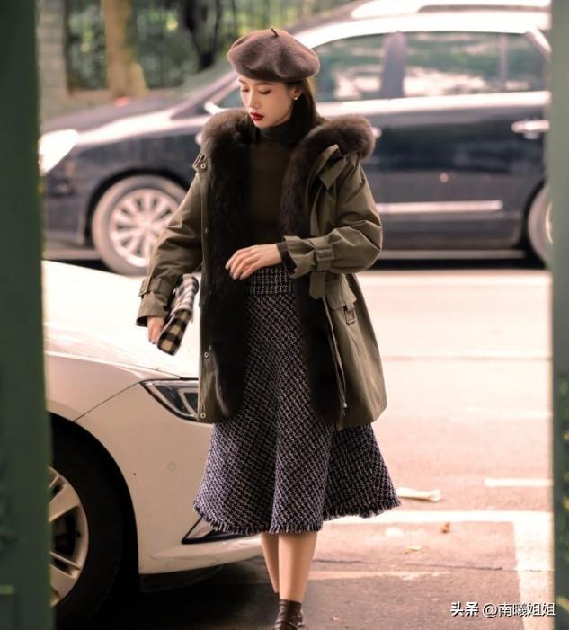腿粗和高个子的女人,冬季穿搭外套都喜欢组合长裙,不仅可以达到合适的保暖果,还有利于拉长身材线条。如果是用派克服来组合长裙,那就选择大毛领的款式,增加了领口部分的量感,更有利于匀称整体的轮廓。