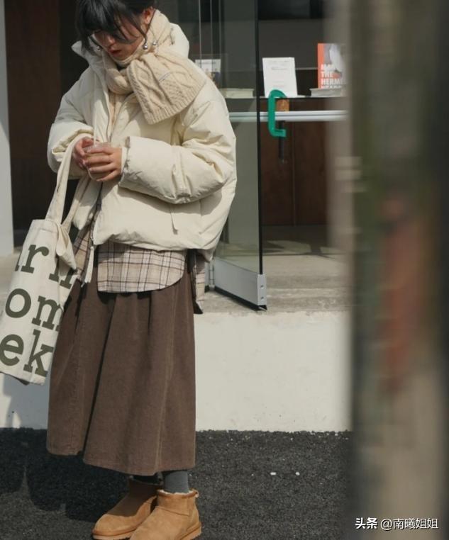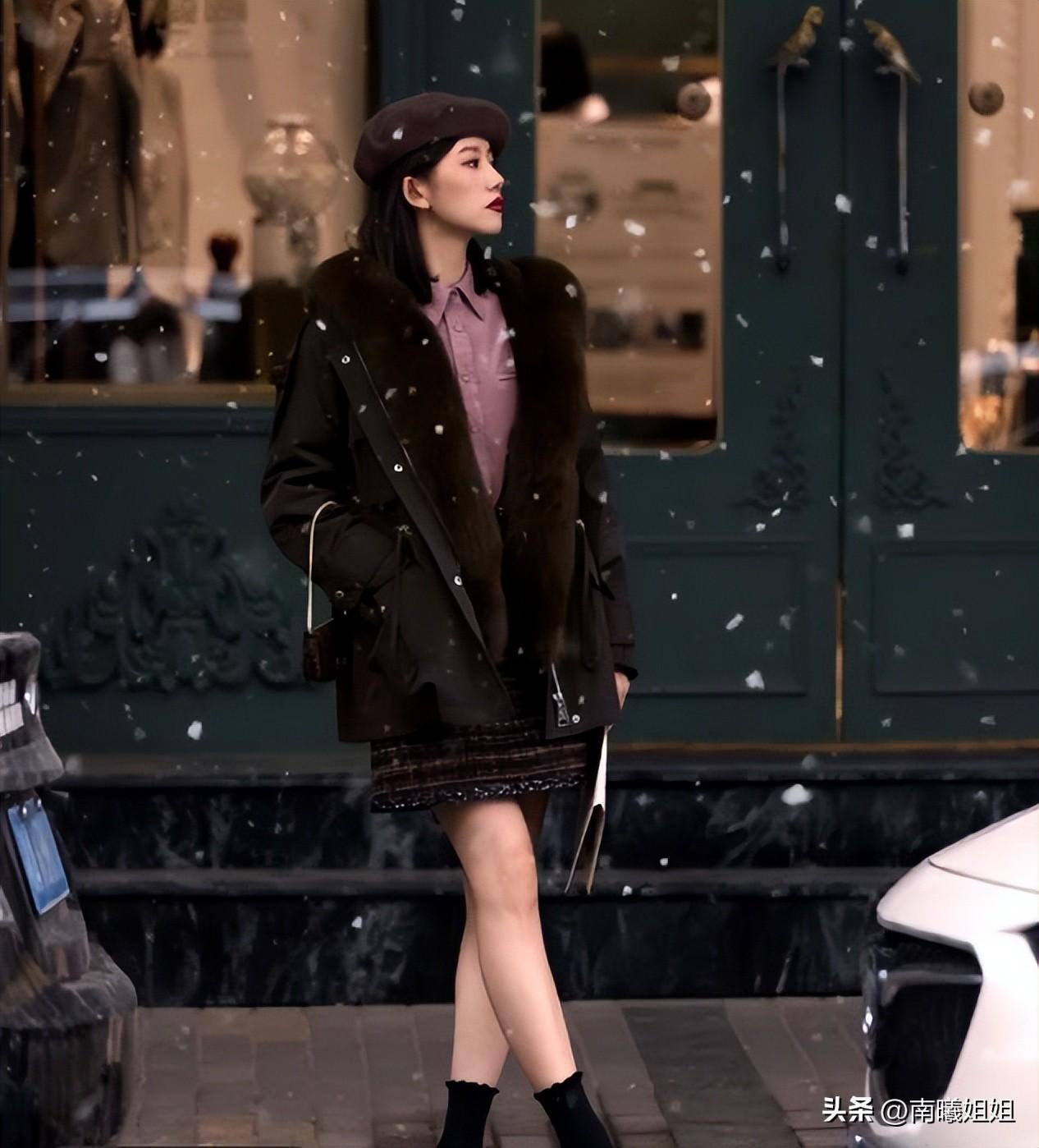 毛呢裙的质感比较温柔,拥有一定的厚度,保暖性更强,组合超短款的派克服可以搭配出温柔感和漂亮的曲线感,30岁以上的通勤党,日常穿搭衣很优雅。