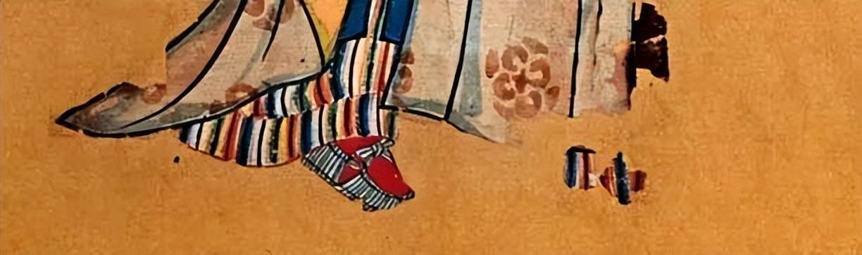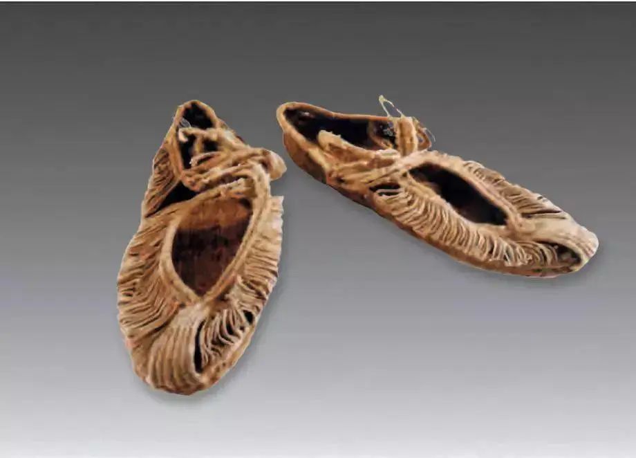 这类线鞋的实物在新疆吐鲁番阿斯塔那古墓群中屡有出土,往往以麻绳编底、丝绳为帮,做工很细致。图像中也有式样与线鞋相仿,但鞋帮不用线编而用锦绣等材料制做的。这种鞋在鞋面正中还装有两枚圆形饰物,估计是玛瑙、琉璃之类,因而会显得更加华丽了。