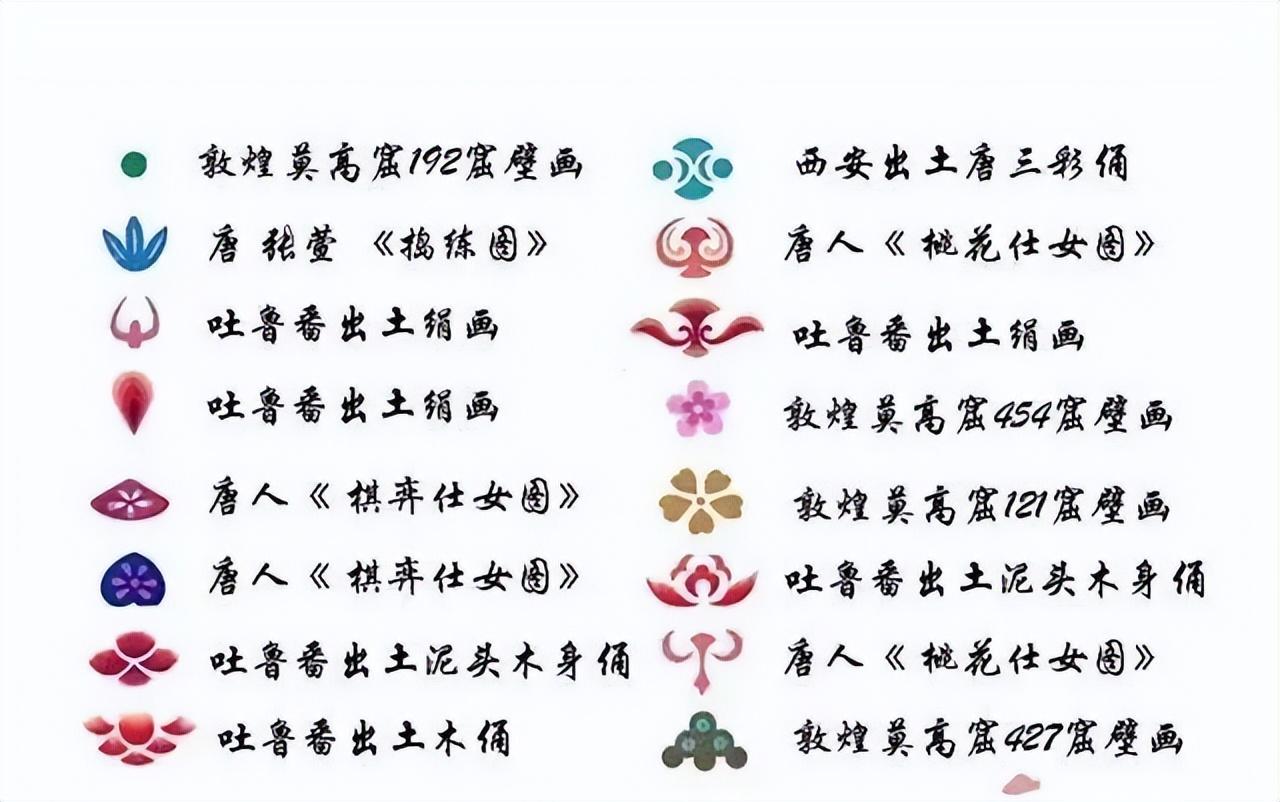 在唐代,花钿除圆形的以外,还有种种繁复的形状。它并非用颜料画出,而是将剪成的花样贴在额前。唐李复言《续玄怪录·定婚店》说韦固妻“眉间常贴一钿花,虽沐浴、闲处,未尝暂去”,可证。用以剪花钿的材料,记载中有金箔、纸、鱼腮骨、鲥鳞、茶油花饼等多种。剪成后用鱼鰾胶或阿胶粘贴。图像材料中所见花钿有红、绿、黄三种颜色。红色的多,吐鲁番阿斯塔那出土的各种绢画、莫高窟唐代壁画中女供养人的花钿,大都为红色。绿色的也叫翠钿,即杜牧诗“春阴扑翠钿”、温庭筠词“眉间翠钿深”、李珣词“翠钿檀注助容光”所咏。