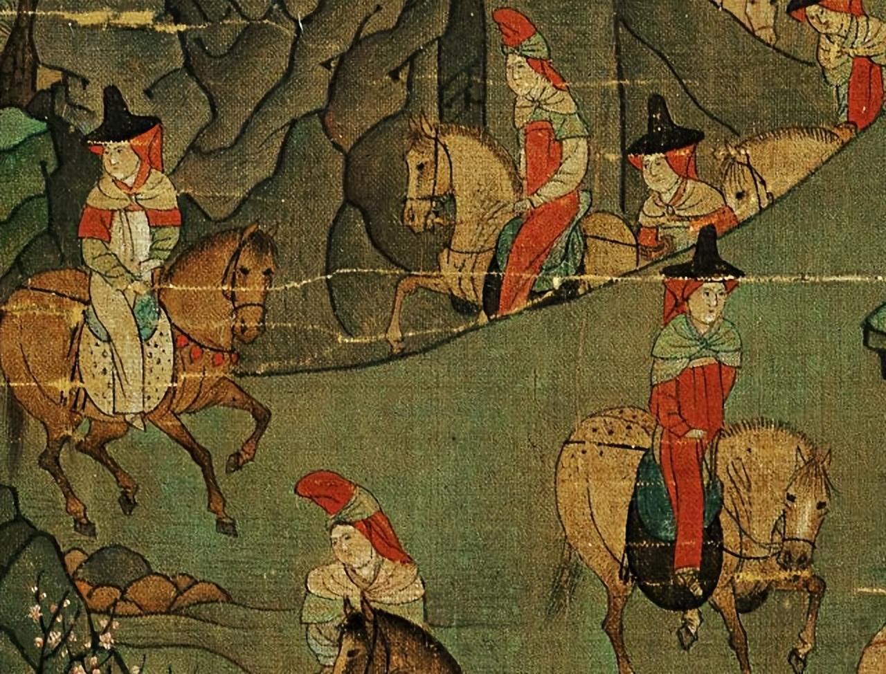 《虢国夫人游春图》女子头戴蹼头,身穿圆领窄袖袍衫,足蹬马皮靴,腰系革带,健美有活力,与男性服饰无异。