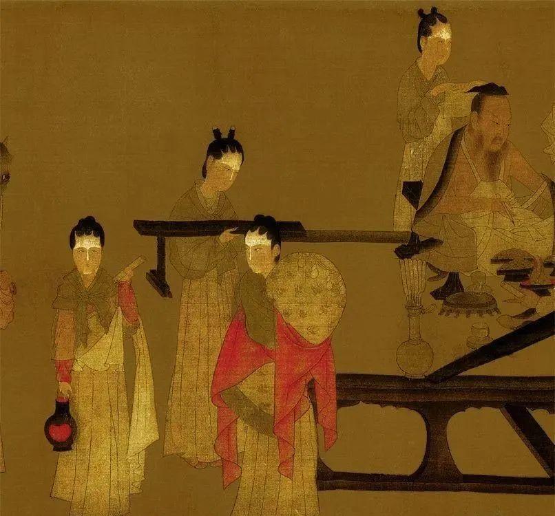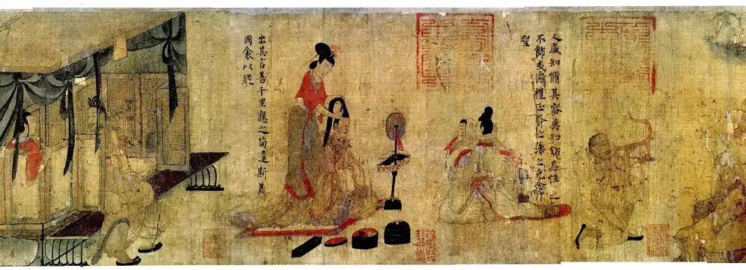 唐人《宫乐图》(摹本)原件藏台北故宫博物院 图绘宫廷妇女二十人,或奏乐、或畅饮,发式各异,有的梳抛家髻,有的梳倭墮髻,有的插梳,有的戴花冠。