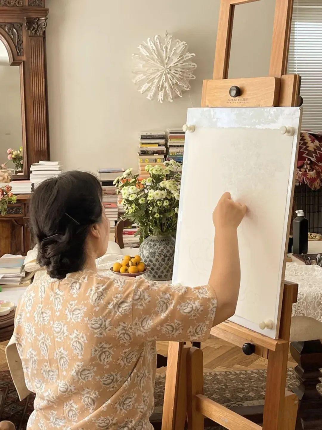 他想要规避老师的“霸权”。没有人教,自然就没有老师来评判画得好不好,反而更相信自己的判断。比起和她聊画,他更喜欢约她去故宫看展览。用眼睛发现,然后种在自己心里。“很多人往往忽略他们观察、塑造、解决问题的潜能。我就想通过我妈来证明这一点。”