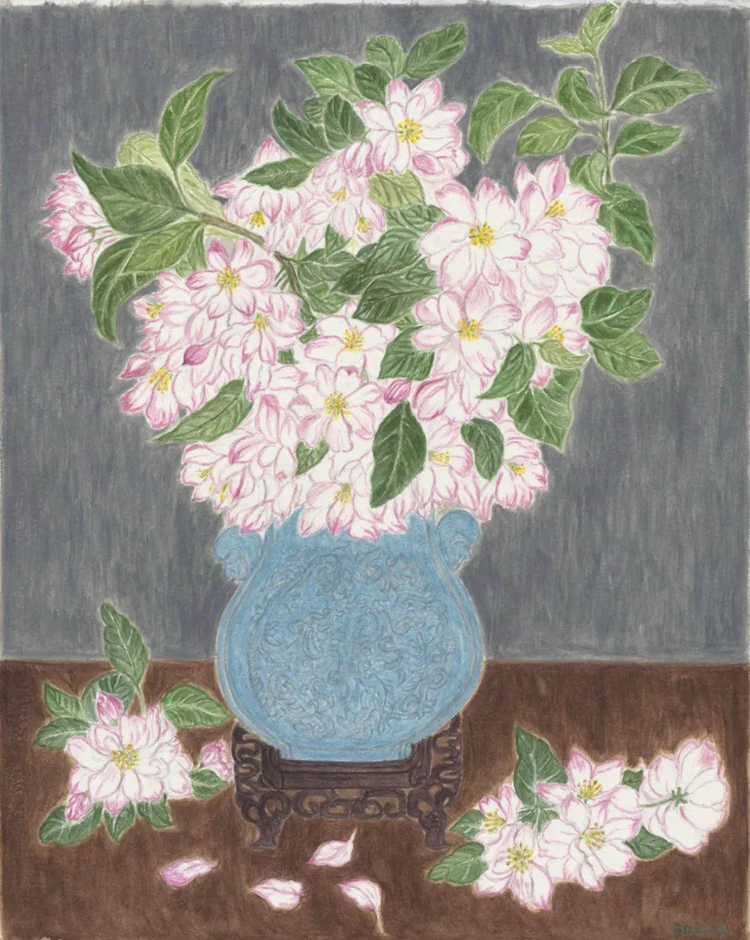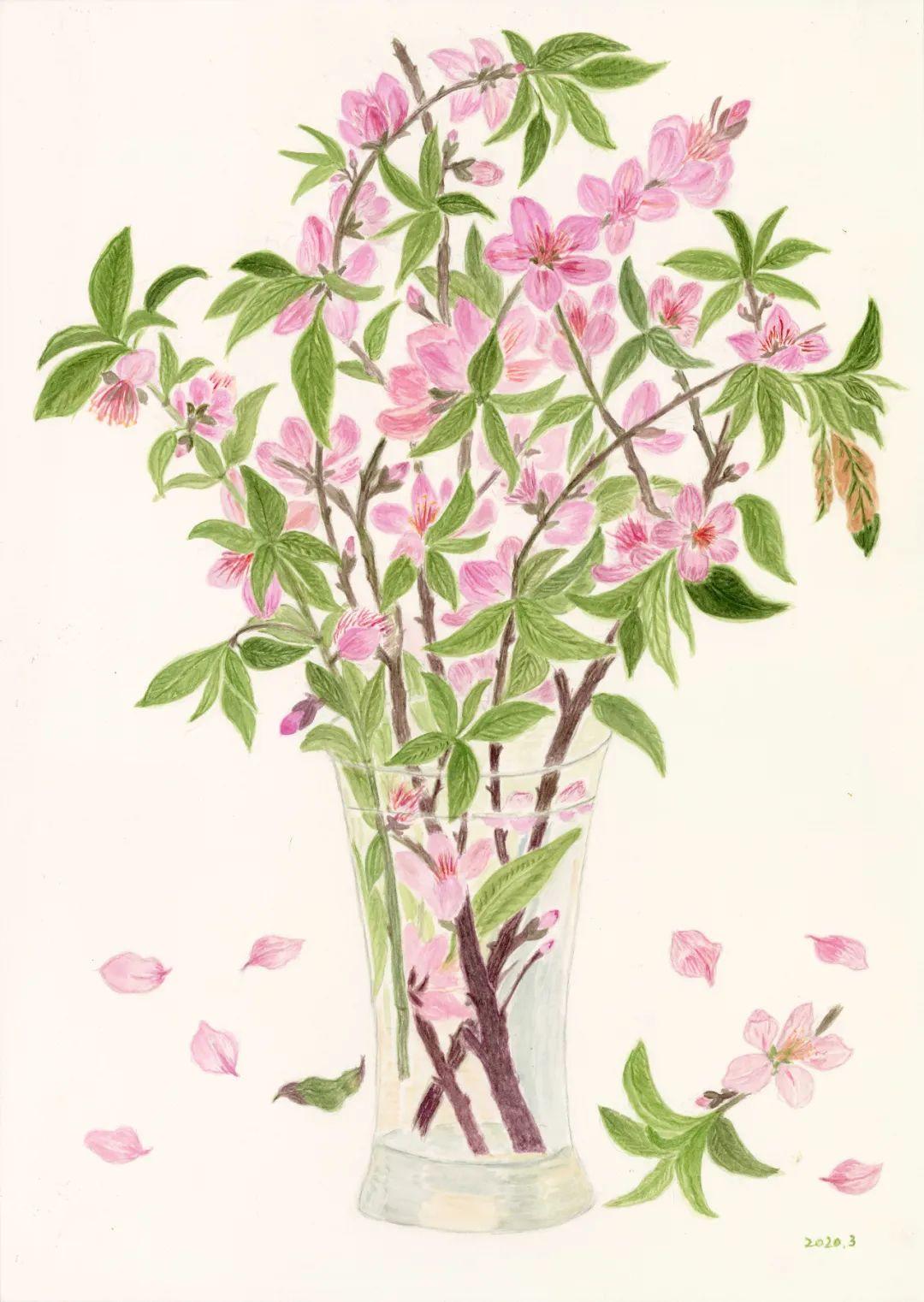 家门口的海棠和桃花开得正好,她随手折几枝来,修剪一下,插进一个合意的花器里。画着画着,感觉真的好像春天来了。她说自己想画出“大自然本来的样子,那种特别朴素的美。”