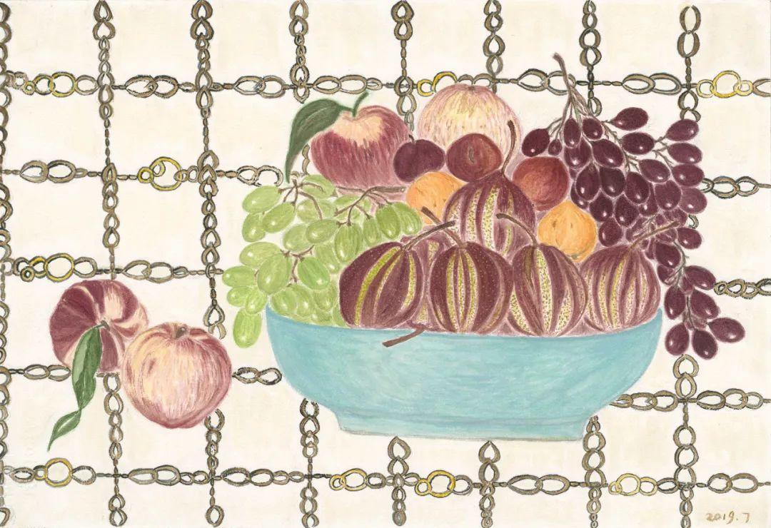 去菜市场,她以前只顾想着今天的菜单,画画以后就不自觉地留意蔬菜的样子,回家照着写生。有人送来桃子,爱琴觉得光画果实有点单调,就去找卖桃子的店家,讨几片叶子。也会去卖零头布的市场,找那种人家没用的,一匹布的边角料,拿回来做垫布,放上瓜果,点缀画面的层次。