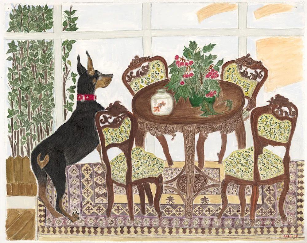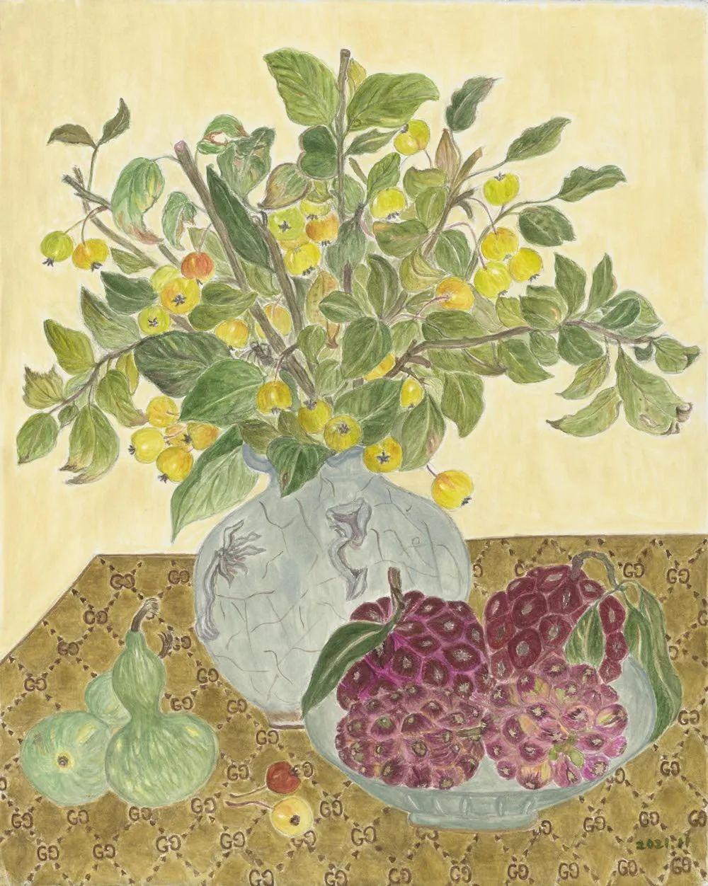 某种程度上,儿子为妈妈生生隔离出了一个温柔的环境。在这里,画画得以保留原初、纯粹的状态:只是因为遇上了几枝很美的花,瞥见了狗狗在窗前动人的神情,碰到了一颗长得奇怪的大白菜。